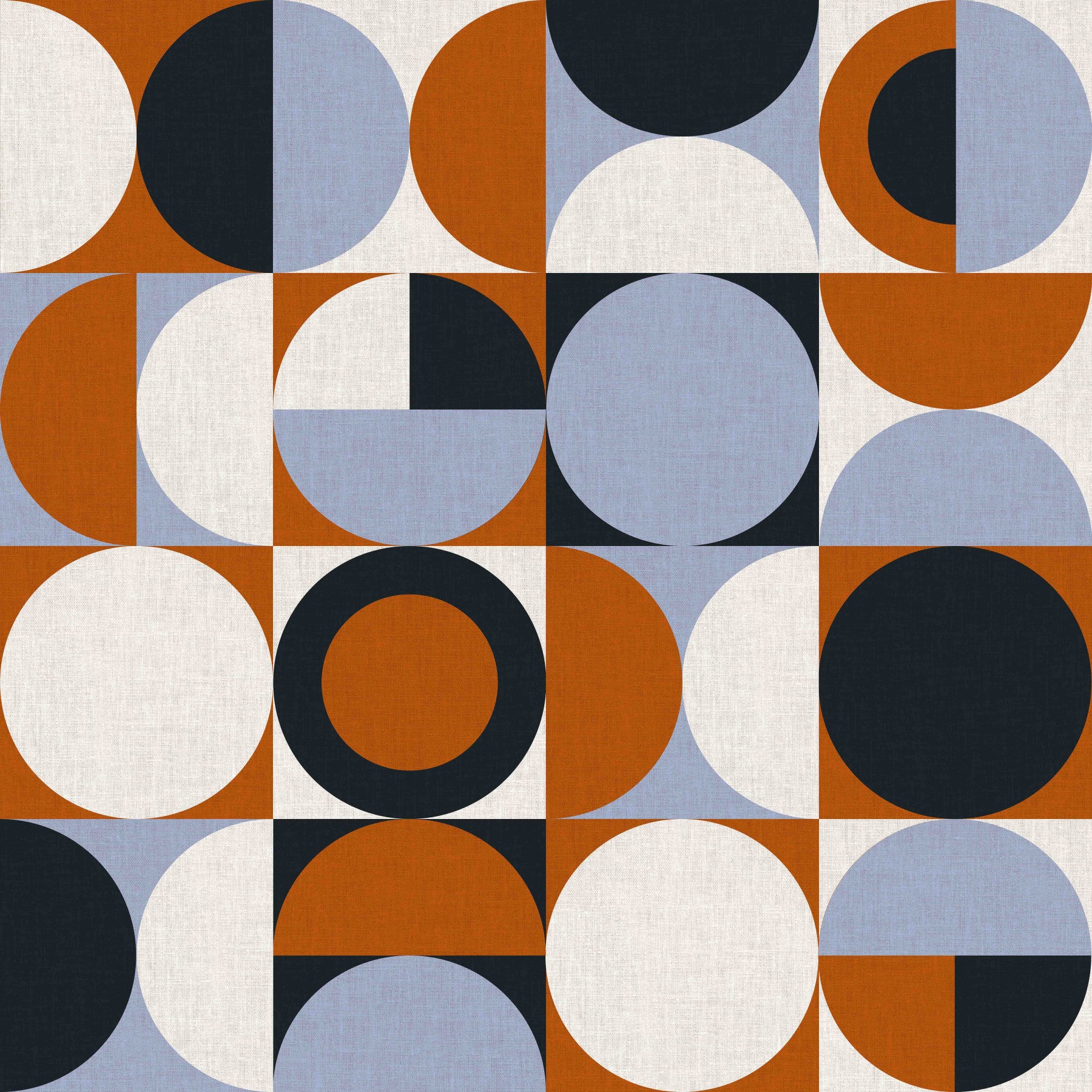 “Mescolanza” embodies a playful yet sophisticated fusion of geometric forms and earthy tones. Circles and squares intertwine in a dynamic dance, creating a visually stimulating wallpaper. The color palette, featuring warm burnt orange, serene pale blue, crisp white, and deep charcoal, evokes a sense of mid-century modern charm. The textured effect adds depth and dimension, suggesting the feel of woven fabric. This captivating design is perfect for adding a touch of retro-inspired elegance to any space, offering a balanced blend of boldness and tranquility.
