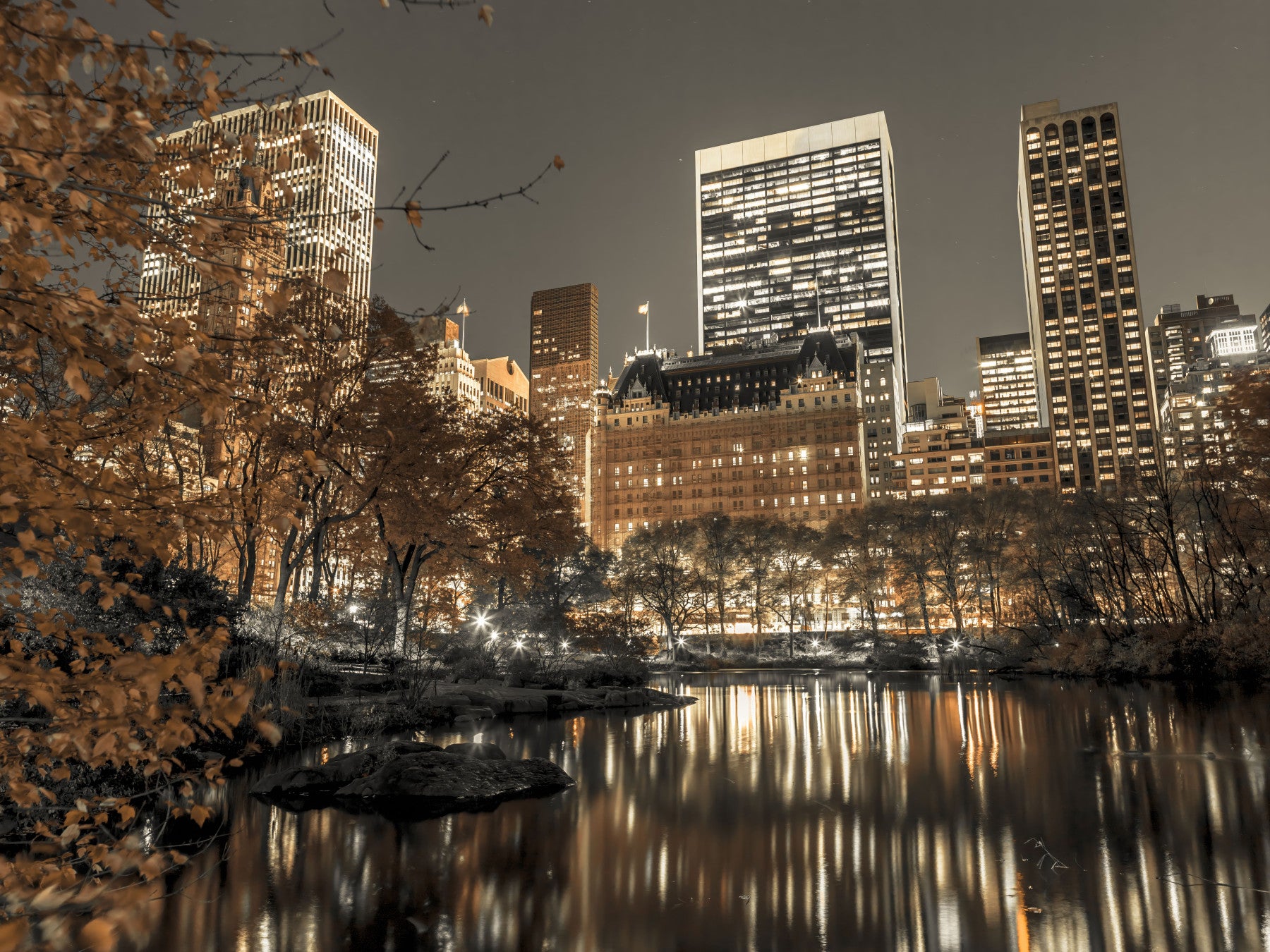 Evening view of Central Park in New York City. Capture the magic of a city skyline at night with this stunning wallpaper. Witness the architectural wonders reflected in the water's calm surface. The blend of natural and urban elements creates a calming yet vibrant ambiance. The sepia tones enhance the reflection's warmth, making it a perfect backdrop for modern living spaces, bedrooms, or offices. Transform your walls with this cityscape. This wallpaper for walls adds a touch of serenity. It complements minimalist or industrial interiors, creating a striking focal point.