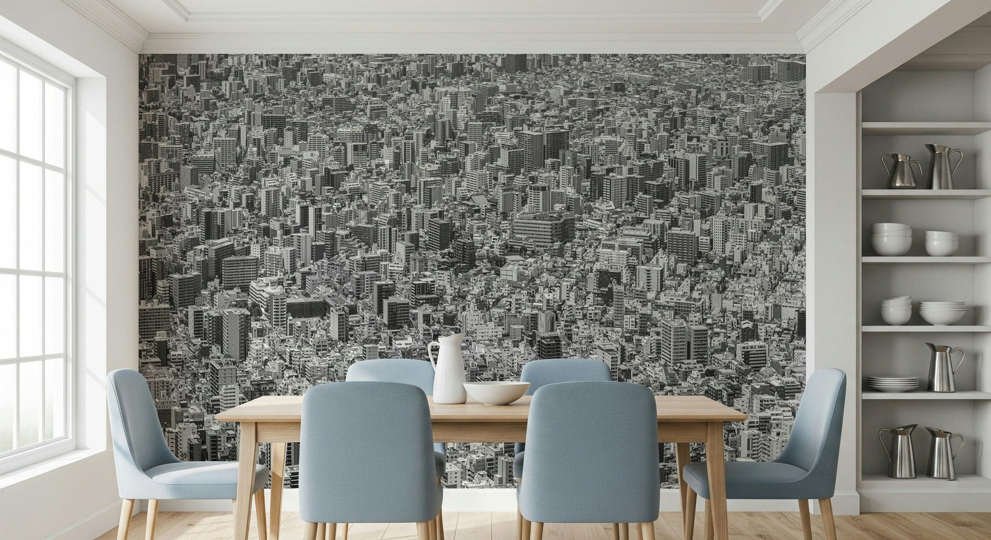 Envision the sprawling heart of urban existence with this detailed monochrome wallpaper for walls. The image presents a dense cityscape, a matrix of buildings creating a compelling visual texture. Gray tones dominate, lending a sophisticated and versatile feel. This design makes a remarkable statement in minimalist living rooms, modern offices, or urban-styled hallways. The architectural density adds depth and intrigue to any space, transforming plain walls into captivating features.