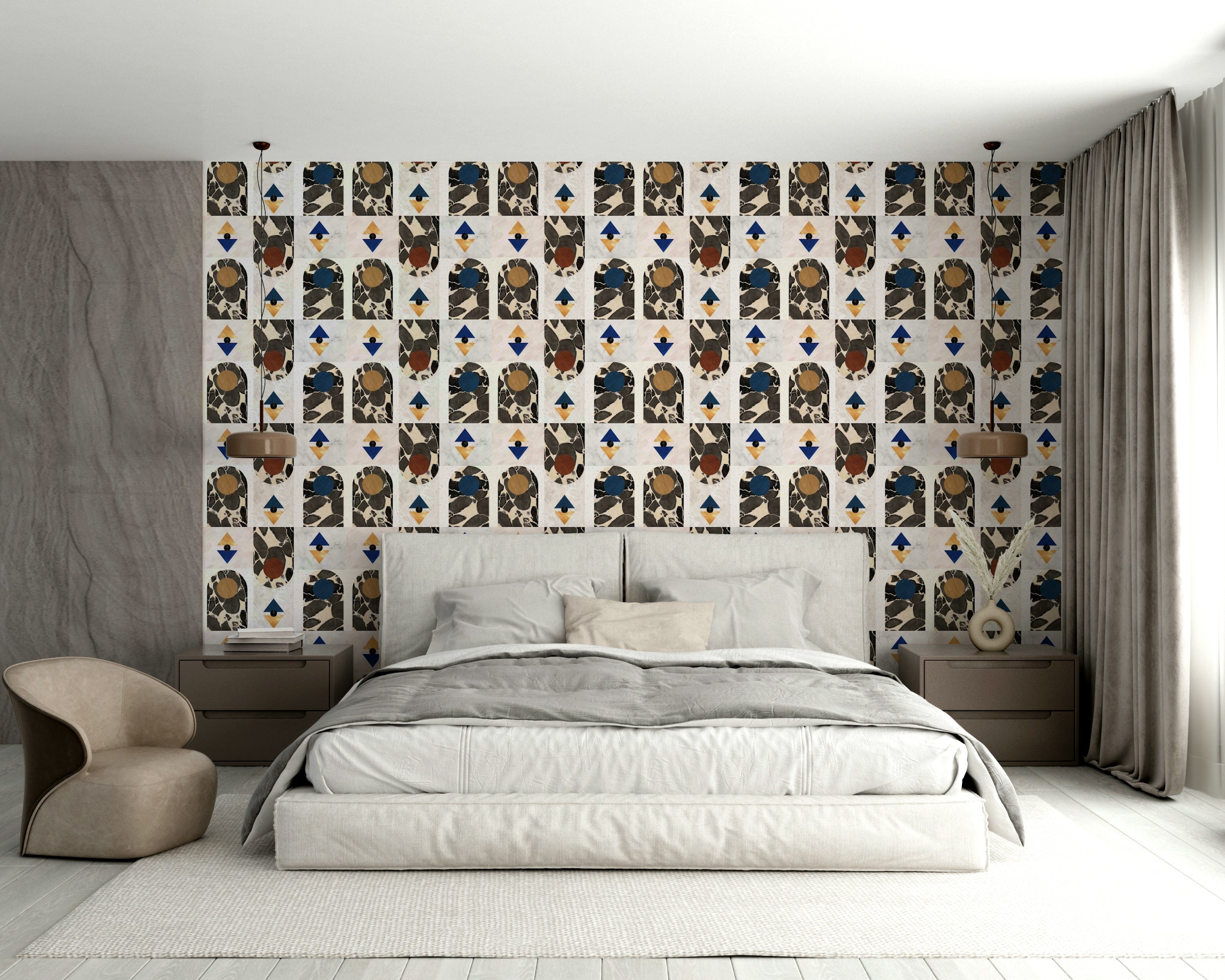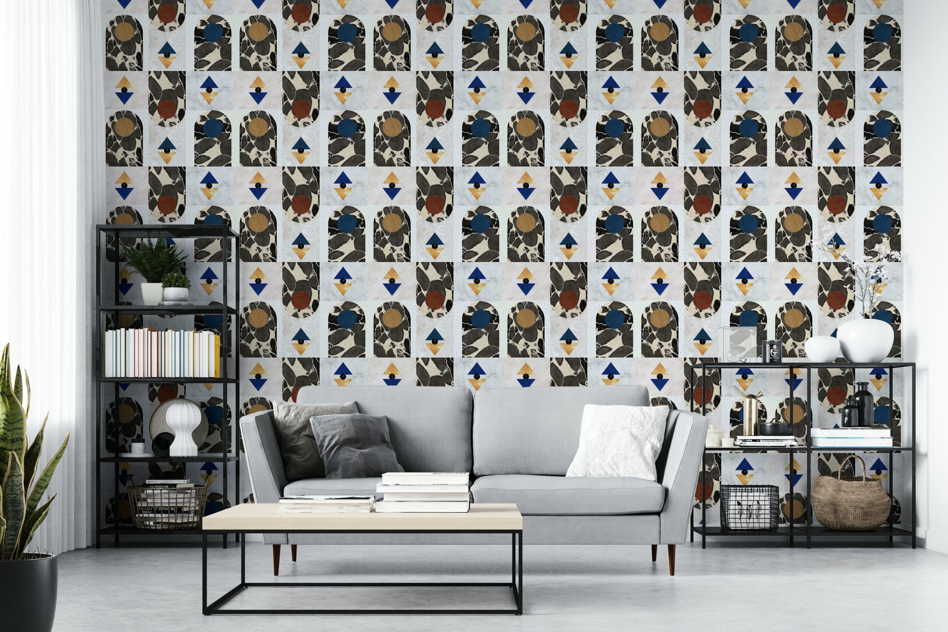 Evoke the timeless elegance of the Mid-Century era with this captivating geometric wallpaper. A symphony of bold shapes – triangles, circles, and arches – are arranged in a structured yet playful pattern. The use of contrasting textures, including faux marble, and distressed, brushed surfaces creates a rich visual depth. Bold color choices in golden yellow, royal blue, terracotta brown and dark gray add a sophisticated pop, while the composition is both balanced and dynamic. Perfect for adding a touch of vintage charm to any modern space.