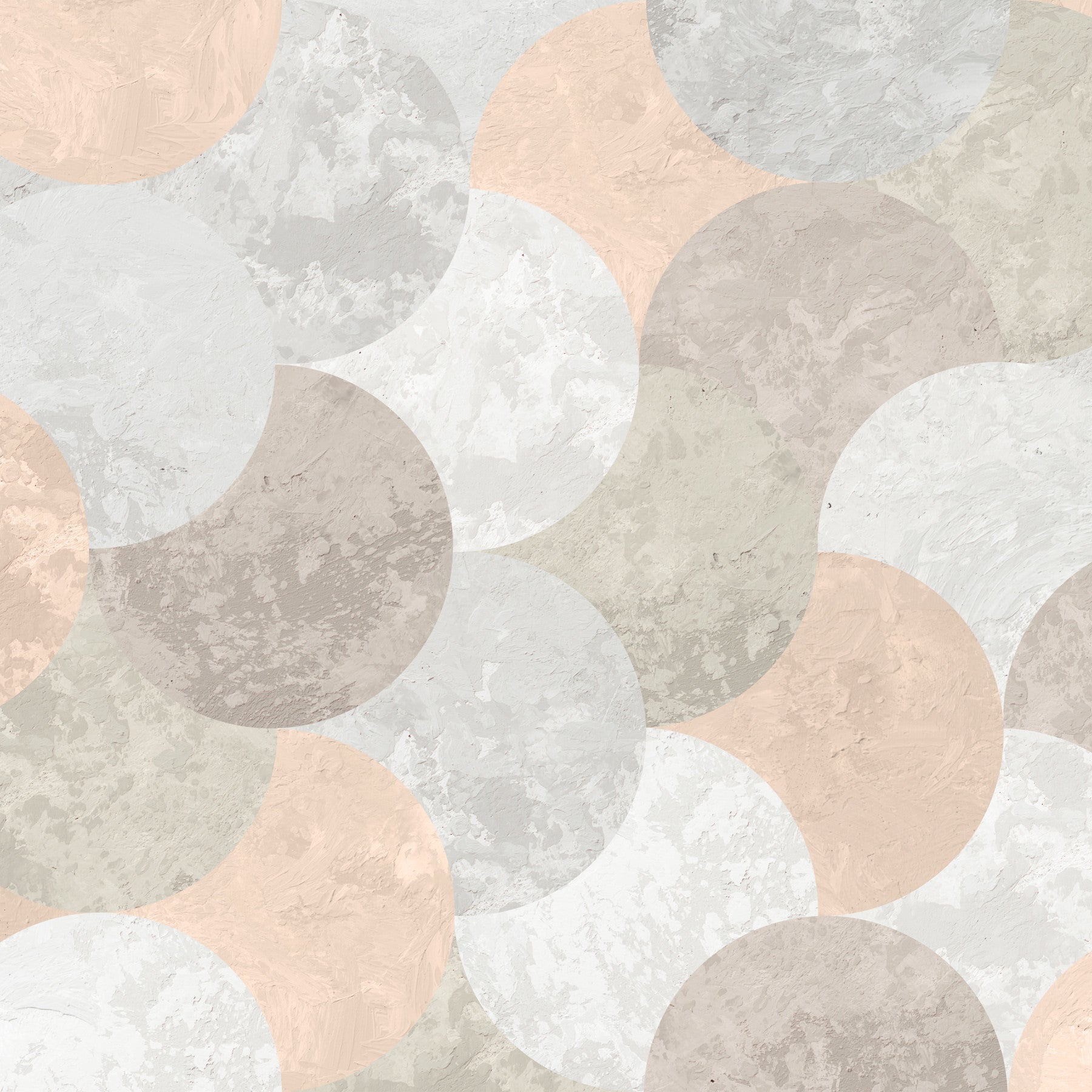 Embrace mid-century modern style with this elegant wallpaper. A sophisticated arrangement of overlapping, textured semi-circles in calming neutral tones creates a visually appealing and balanced design. The subtle interplay of warm peach and cool greys evokes a sense of calm sophistication, reminiscent of classic architectural patterns. This wallpaper's textured surface adds depth and interest, lending a tactile quality to its clean geometric forms. Perfect for adding a touch of retro charm and modern minimalism to any space.
