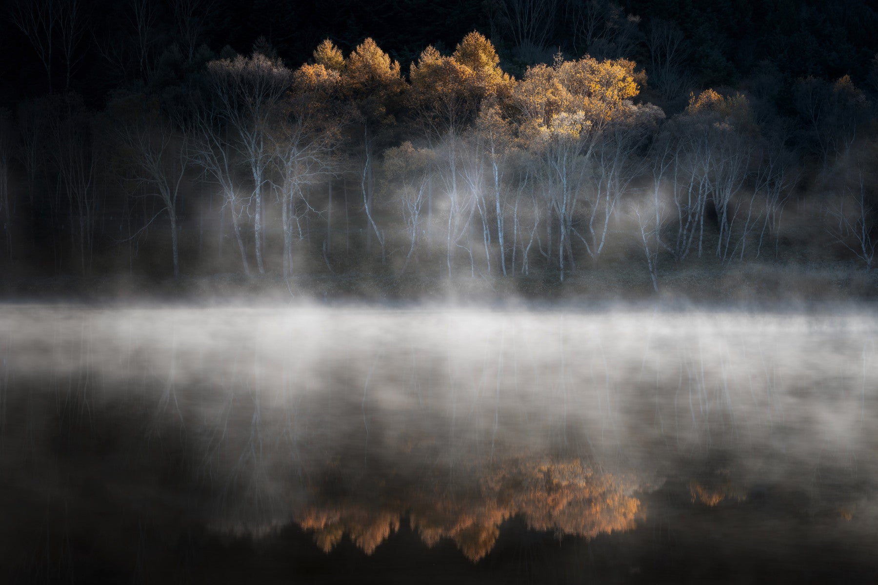 Dark water reflection, white skeletal trees, misty lake, Mist and Light Woodland.