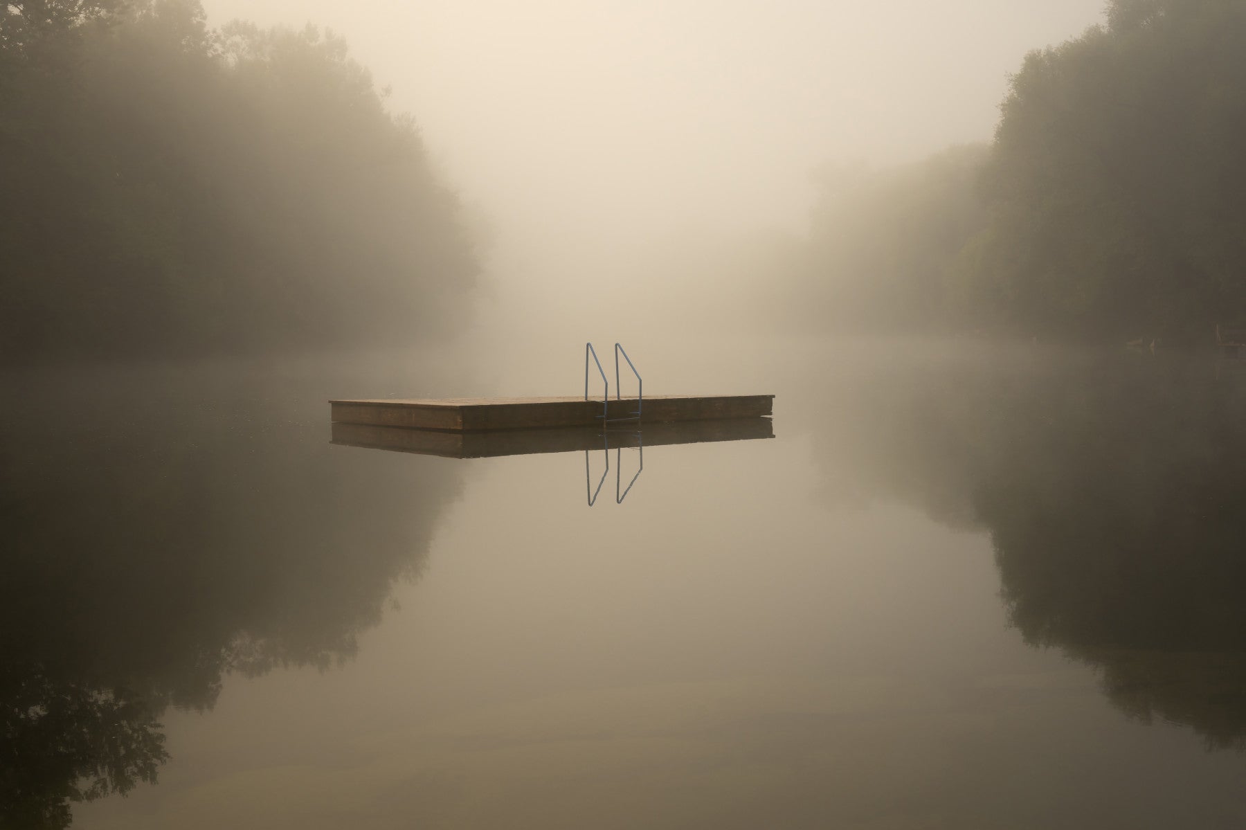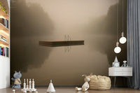 This stunning wallpaper creates a calm, serene mood with its soft, muted tones. A wooden dock with a blue ladder sits in a mist-covered lake, inviting you to relax. The design offers a peaceful escape, making it great for bedrooms, living rooms, or offices. This wallpaper for walls enhances interior spaces by adding a touch of nature's stillness and quiet beauty. It blends well with minimalist or Scandinavian décor.