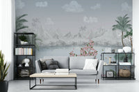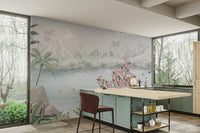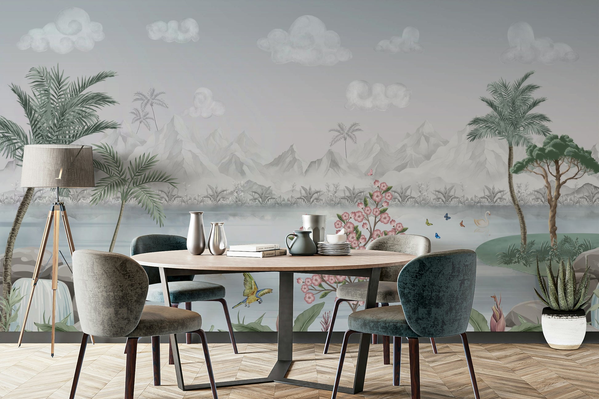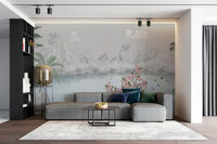 Indulge your senses with this captivating wallpaper showcasing a misty mountain lake scene. The muted tones and soft brushstrokes evoke a sense of calm and tranquility. Lush tropical plants frame the serene waters, where elegant swans glide peacefully. Pink flowering trees add a touch of delicate beauty, while butterflies flutter gently in the air. This design is perfect for adding a touch of sophisticated serenity to your living space.