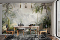 Create a lush paradise with this tropical jungle wallpaper featuring misty mountains and dense palm trees. The soft watercolor tones bring a botanical forest mural effect, adding depth and freshness to any setting. This exotic rainforest wall decor captures nature's beauty with towering palms and layered greenery. Designed to bring an organic feel, this palm tree wallpaper mural suits living rooms, bedrooms, and offices. The misty background blends seamlessly with the foliage, enhancing the illusion of a tropical escape. Experience the essence of nature with this tropical paradise wallpaper, perfect for adding a refreshing, natural element to your walls.