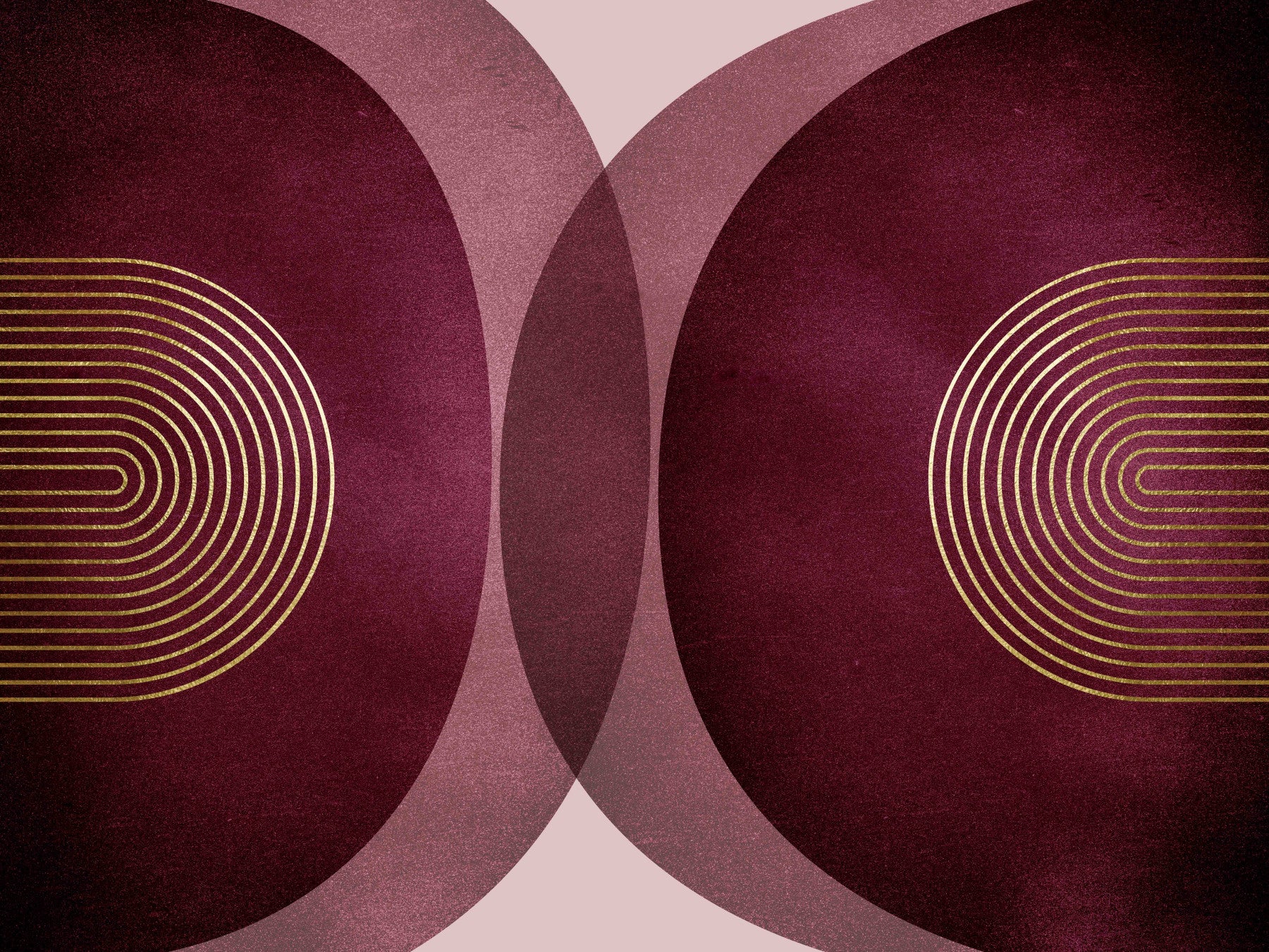 Indulge in the sophisticated elegance of this Modern Mid Century Burgundy wallpaper. Rich burgundy hues, reminiscent of a luxurious wine, form the backdrop for subtly textured, overlapping circles. Delicate gold metallic lines, arranged in elegant concentric arches, add a touch of refined glamour, echoing the geometric patterns of mid-century modern design. This wallpaper exudes a sense of calm sophistication, perfect for adding a touch of vintage-inspired luxury to any contemporary space. The interplay of deep burgundy and muted rose tones, contrasted with the shimmering gold, creates a visually stunning and harmonious design that is both modern and timeless.