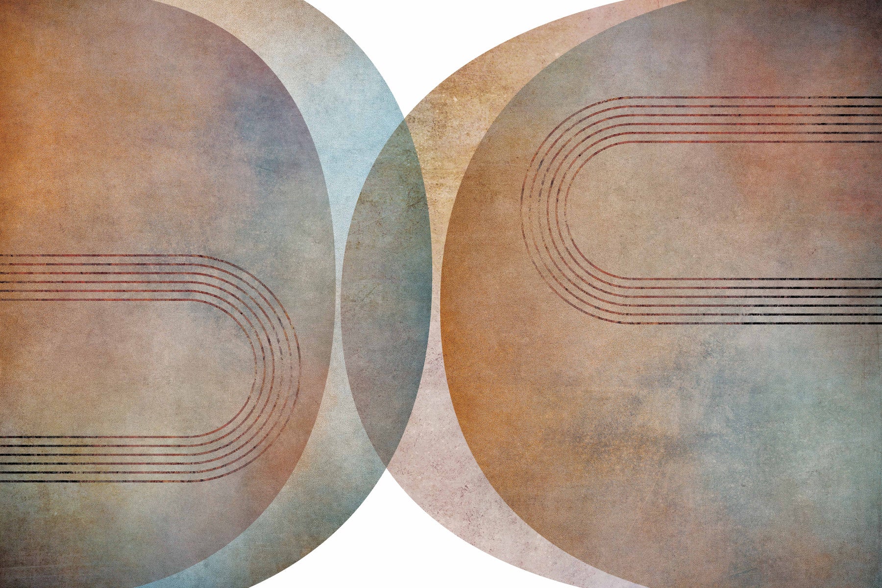 Embrace the elegance of mid-century modern design with this captivating wallpaper. Two overlapping, textured circles in warm earth tones create a sense of depth and calm. Subtle, curved lines in a contrasting copper hue add a touch of geometric sophistication, reminiscent of iconic furniture designs from the era. The slightly distressed, almost vintage-like texture of the background adds a layer of warmth and personality, making this wallpaper a perfect choice for adding a touch of retro-inspired style to any space. This design effortlessly blends organic shapes with clean lines, delivering a sophisticated and timeless aesthetic. It’s a perfect balance of modern minimalism and the classic curves of mid-century design.