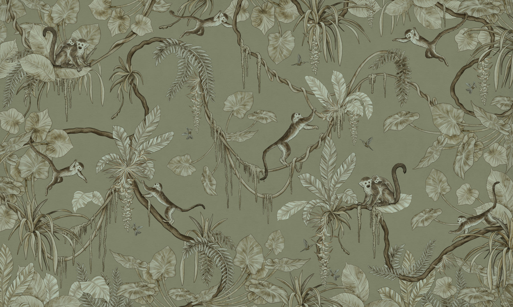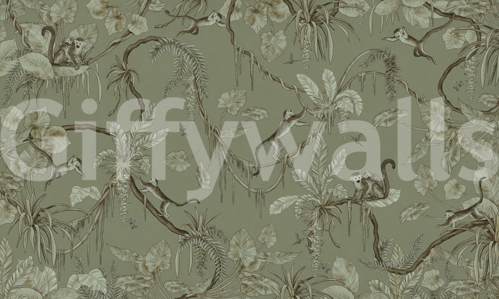 Bring the jungle inside with this captivating design. Monkeys frolic amidst lush tropical foliage, rendered in soft beige and khaki tones. This wallpaper for walls creates a relaxing, natural atmosphere. Ideal for a nursery, living room, or bedroom, the detailed illustration works well with classic or modern furniture, lending a touch of playful sophistication to your interiors.