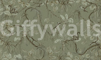 Exotic jungle mural featuring monkeys resting amid flowering vines