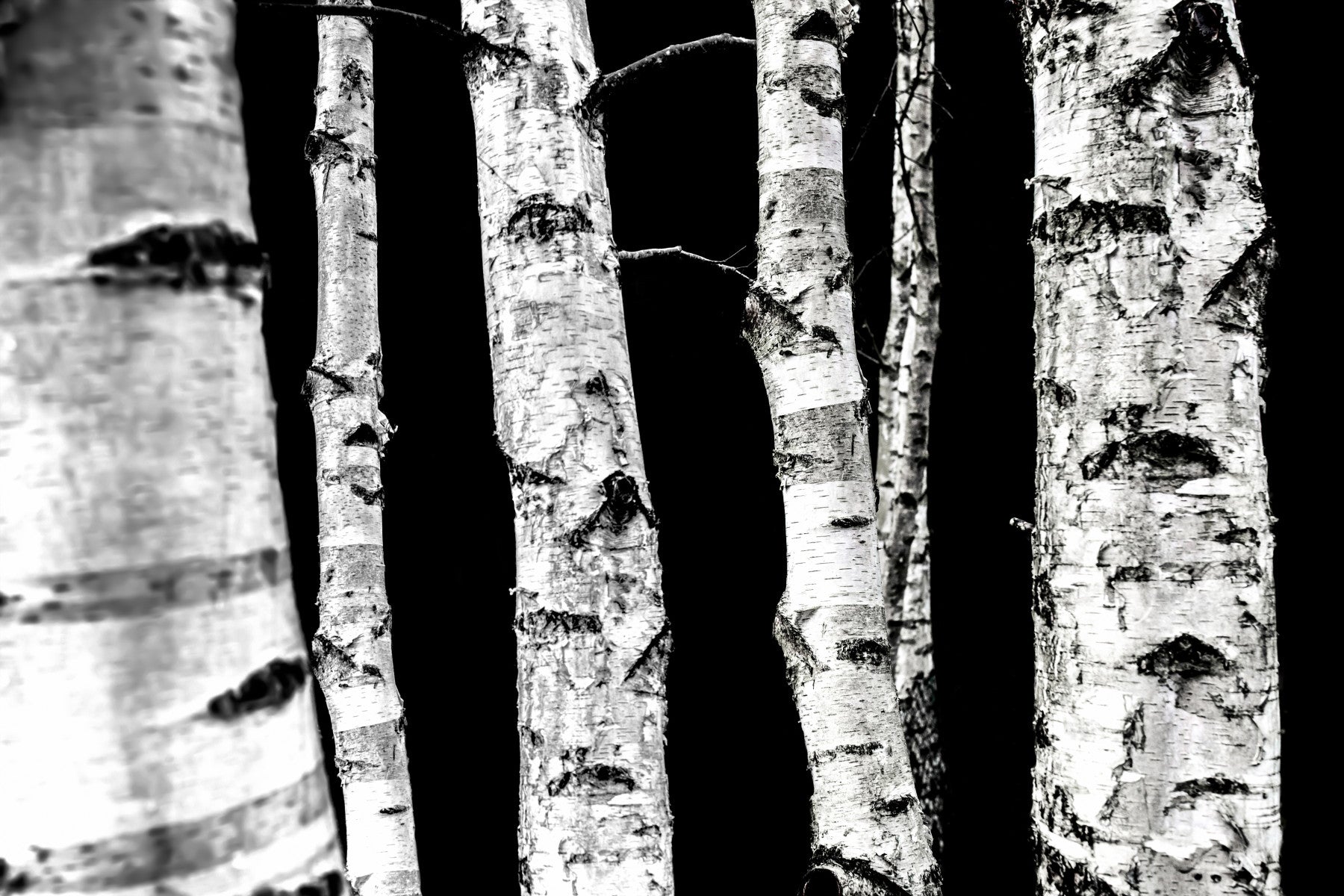 Abstract wall mural of woods; high-contrast grayscale birch trees.
