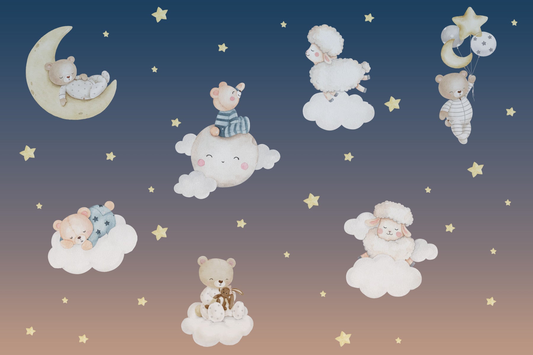 Bring a sense of wonder to your space with this delightful wallpaper for walls. The design features cuddly teddy bears and charming sheep relaxing on moons and clouds, surrounded by twinkling stars. The soft color palette transitions from a deep blue night sky to a warm peachy dawn. This adds a layer of warmth. It's a charming choice for a nursery, bedroom, or playroom. This design complements interiors by creating a sense of comfort and imaginative play.