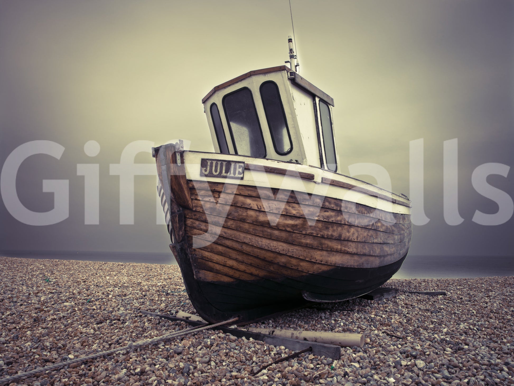 Evoke the serenity of the seaside with “Moored Tranquility,” a wall décor piece that captures the essence of quiet contemplation. This evocative image showcases a weathered fishing boat, named “Julie,” resting peacefully on a pebbled shore. The muted tones of the sky and sea create a soothing backdrop, highlighting the rich textures of the boat's wooden hull. The scene whispers of forgotten voyages and the enduring connection between man and the sea. The sturdy vessel, firmly grounded, emanates a sense of stillness and permanence, a refuge from the restless waves beyond. Bring a touch of coastal charm into your space with this timeless image, perfect for creating a calming atmosphere in any room. Let “Moored Tranquility” serve as a daily reminder to find peace in the present moment, just like the steadfast boat resting on the shore.
