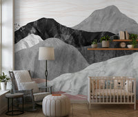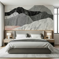 Transform your walls with this modern mountain vista. Neutral tones of gray marble, black rock, and blush accent give your space a tranquil feel. A flock of birds soars above the peak, adding a touch of life to this calming landscape. This wallpaper for walls brings a contemporary style to living rooms, bedrooms, or offices. The neutral palette effortlessly matches a variety of interior design styles, enhancing the room with a subtle yet refined elegance.