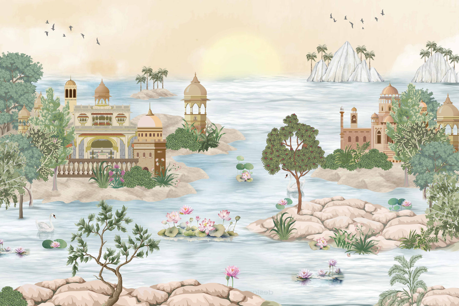 Grand palaces stand gracefully by a serene lake wallpaper mural, reflecting their intricate details in the calm waters. Lush gardens bloom with vibrant lotus flowers, creating a water garden wallpaper that captures nature's beauty. Birds glide across the sky, enhancing the elegance of this royal palace wallpaper. The delicate architecture of domes and archways showcases a traditional Indian palace mural, bringing historical charm to the interiors. Towering palm trees and rolling hills add depth to the scenic landscape mural. This Mughal architecture wallpaper highlights timeless beauty, offering a glimpse into the grandeur of ancient craftsmanship and regal serenity.