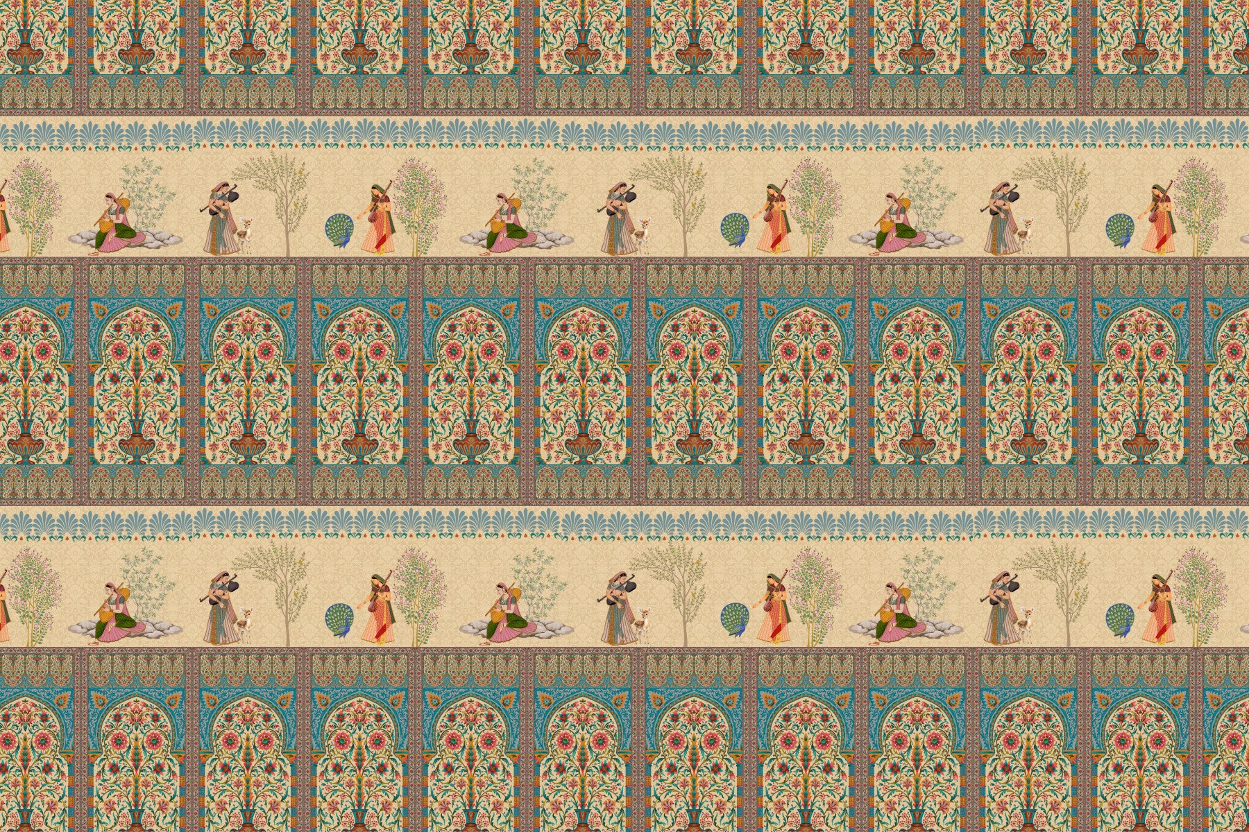 Transform your living space with this captivating wallpaper for walls, inspired by Mughal artistry. The design presents delicate figures playing instruments amidst flowering trees, framed by ornate arches and decorative borders. A palette of beige, turquoise, coral, and green creates a harmonious blend, lending a touch of historical elegance to any room. Imagine this enriching the ambiance of your living room, dining room, or bedroom, imparting a sense of cultural richness and artistic flair. This wallpaper enhances your interior with sophistication and serene beauty.