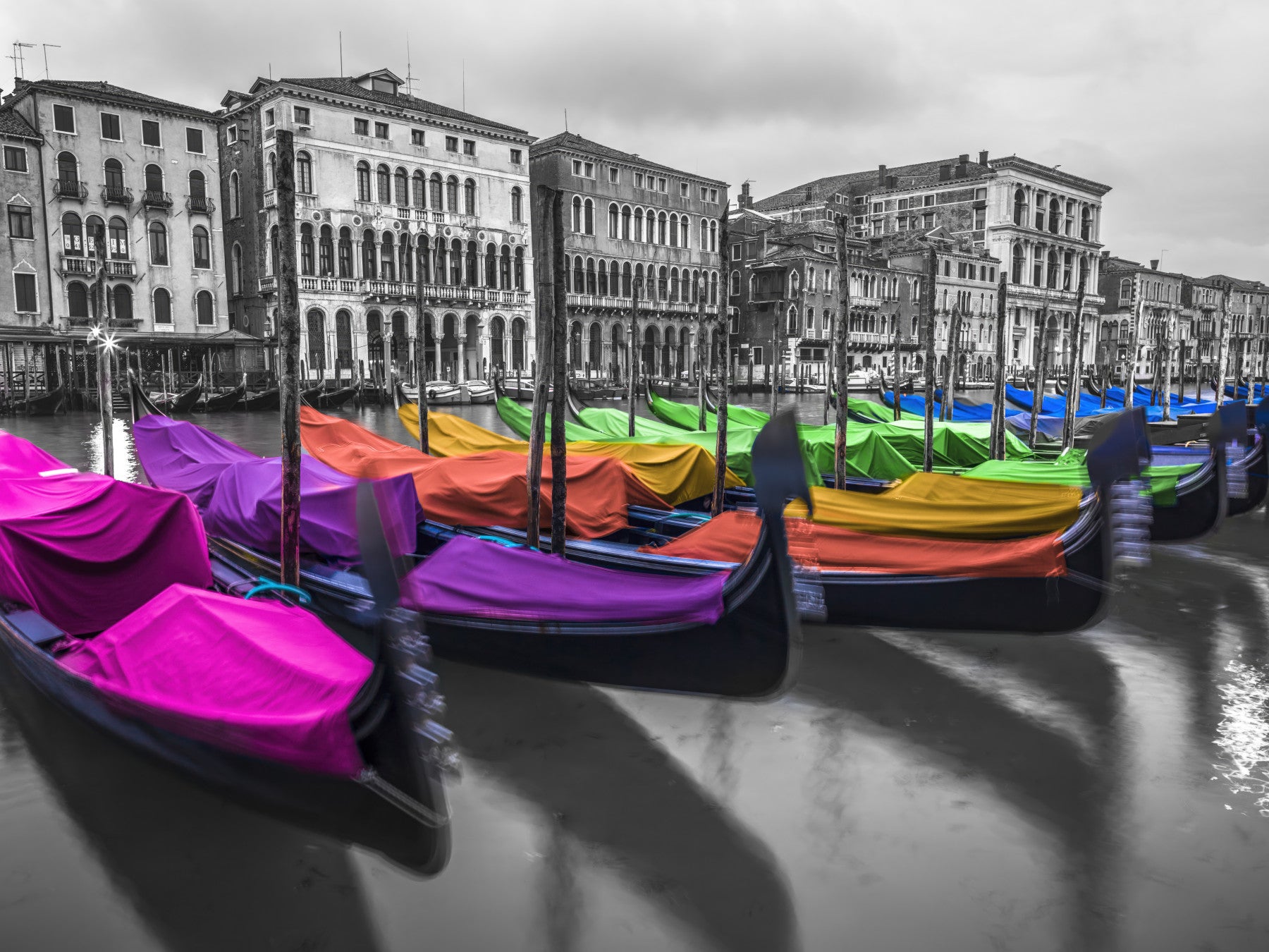 Colorful gondolas in Venice captured in modern mural design