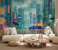 Transform your room with this striking vision of a futuristic metropolis. This wallpaper for walls plunges you into a vibrant cityscape with flying vehicles and luminous neon signs reflecting on rain-slicked streets. A dynamic blend of blues, pinks, and grays evokes a sense of technological advancement and urban energy. This wallpaper enhances hallways, living rooms, and even home offices with its bold aesthetic. It complements modern interiors, adding a touch of cyberpunk cool and a forward-thinking atmosphere. Let this mesmerizing scene redefine your space.