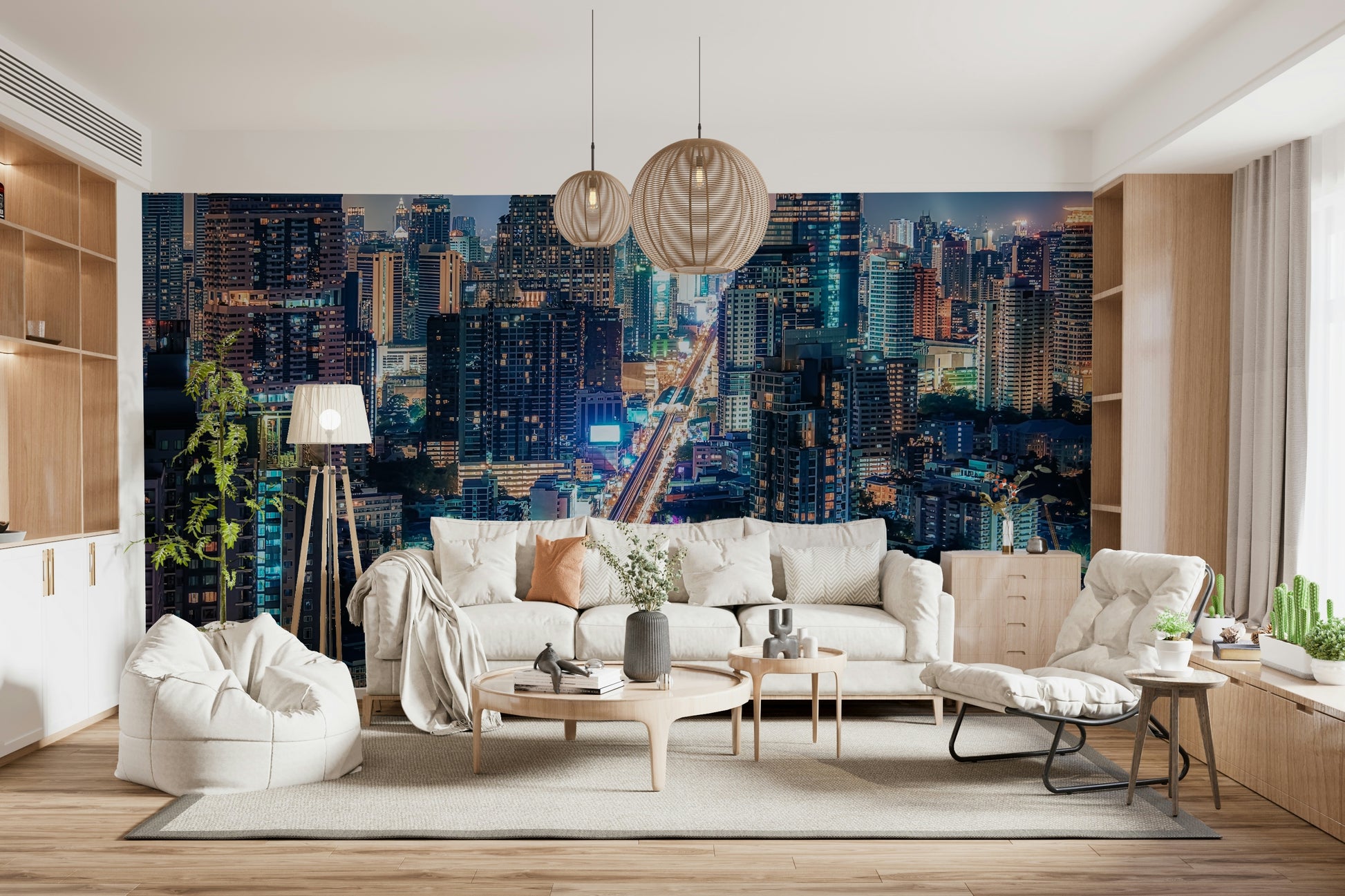 Capture the electric energy of a vibrant city with this stunning cityscape wallpaper. The design shows a sprawling metropolis at night, illuminated with an array of neon lights and towering buildings. The cool blue and warm gold tones create a modern, sophisticated vibe. It adds depth and dimension to your living room, bedroom, or office. This wallpaper for walls is sure to transform any space into a stylish urban sanctuary and beautifully complements modern interiors.