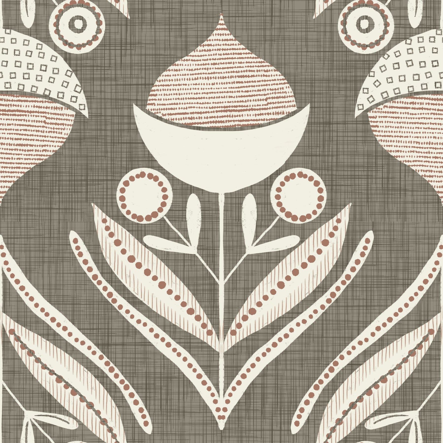 Warm gray wallpaper with symmetrical folk-inspired floral illustrations in calming neutral hues