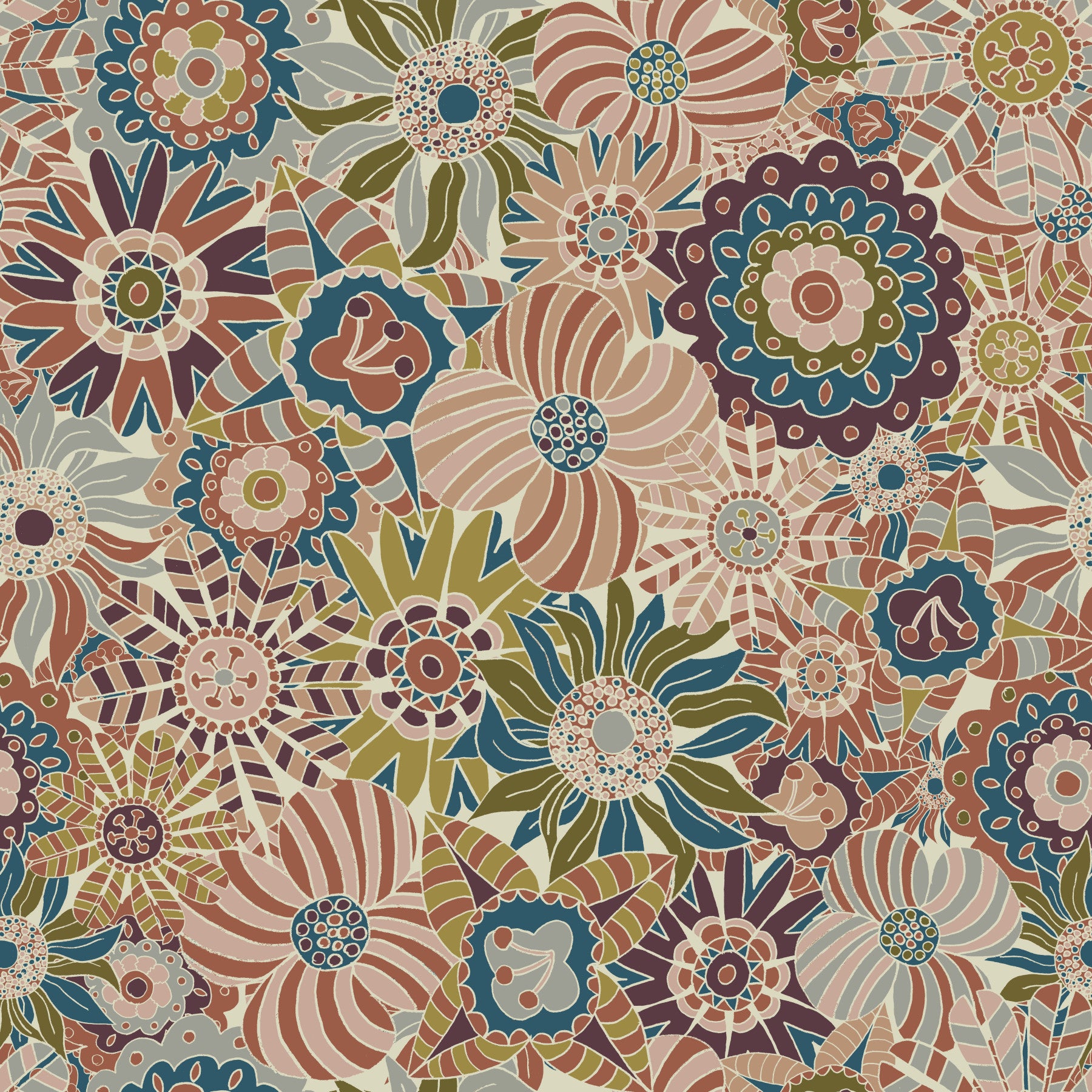 Wallpaper with a pattern of various colorful flowers.