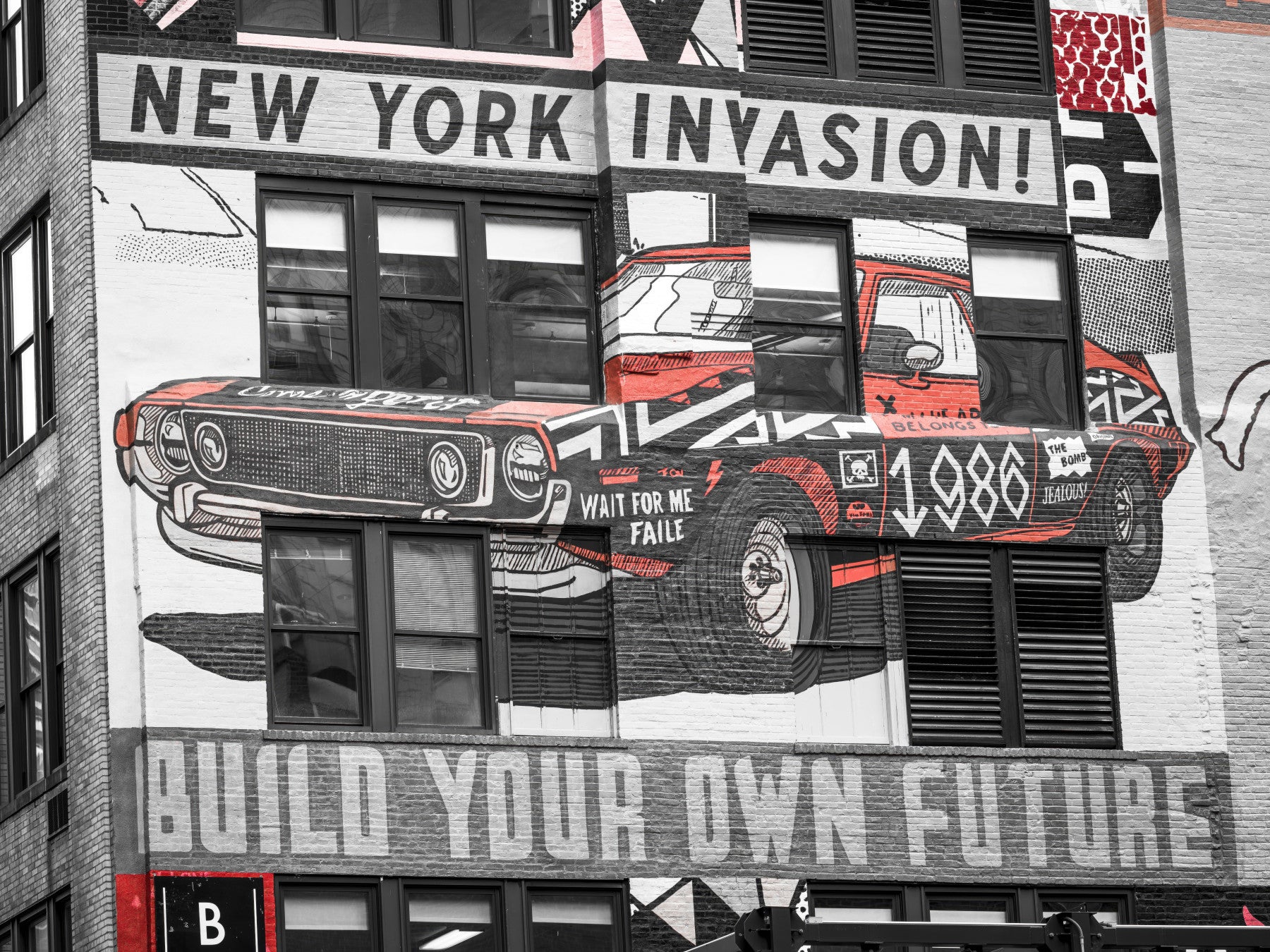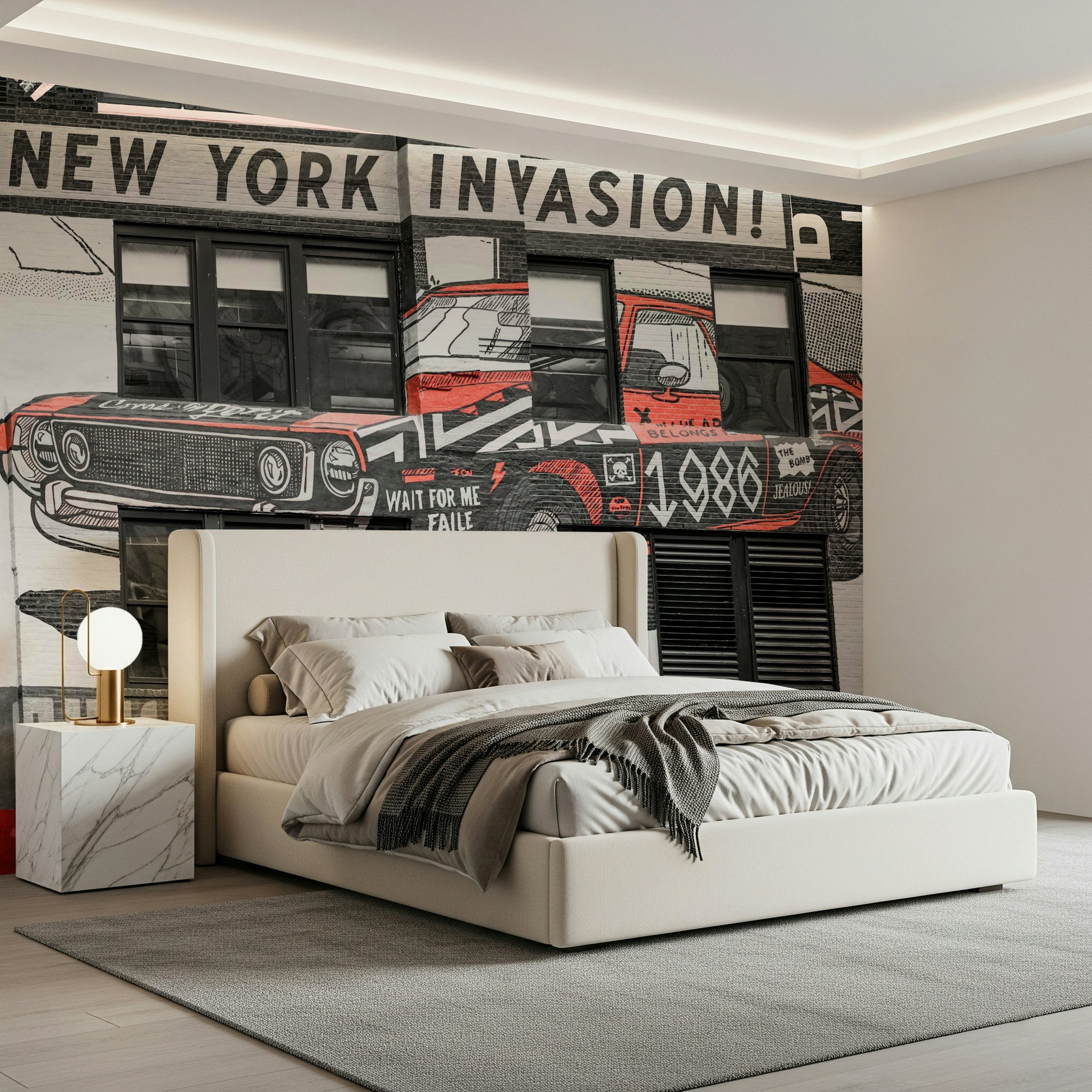 Advertisements on building exterior, New York. Capture the energy of New York with this bold building mural. The striking design features a vintage car illustration in black, white, and red, set against a brick background with impactful text. This wallpaper for walls adds an urban edge to any space. Perfect for living rooms, studios, or teen bedrooms. Let this artwork become a statement, reflecting a modern, artistic lifestyle. Install it to boost a creative vibe and inspire forward thinking.