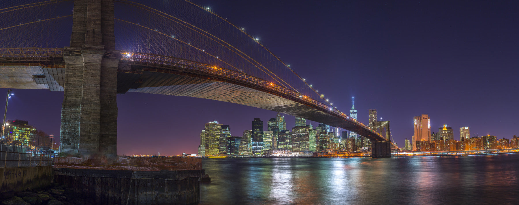 Brooklyn bridge over East river, Lower Manhattan, New York. Transform any room with this breathtaking wallpaper for walls. The Brooklyn Bridge shines bright against the Manhattan skyline at night. The water shimmers with reflected light, creating a mesmerizing effect. The scene inspires a sense of wonder. This design works especially well in living rooms and home offices. The contrast of dark and light colors complements many interior styles, creating a refined and stylish atmosphere.