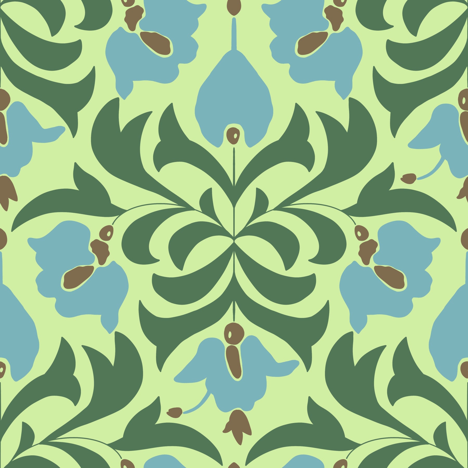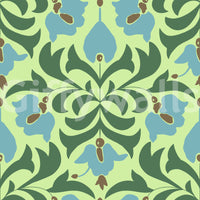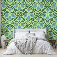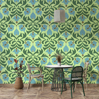 Give your space a refreshing update with this balanced botanical design! The wallpaper showcases a pattern of symmetrical light blue floral shapes and green leafy elements, all on a light green field. Ideal for creating a relaxing vibe in your bedroom, living area, or hallway, this wallpaper for walls incorporates a retro floral look. Its balanced style pairs well with different decor schemes. Refresh your space with this nature-inspired wall decor that combines simple elegance with timeless appeal.