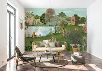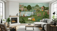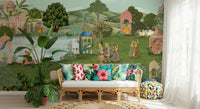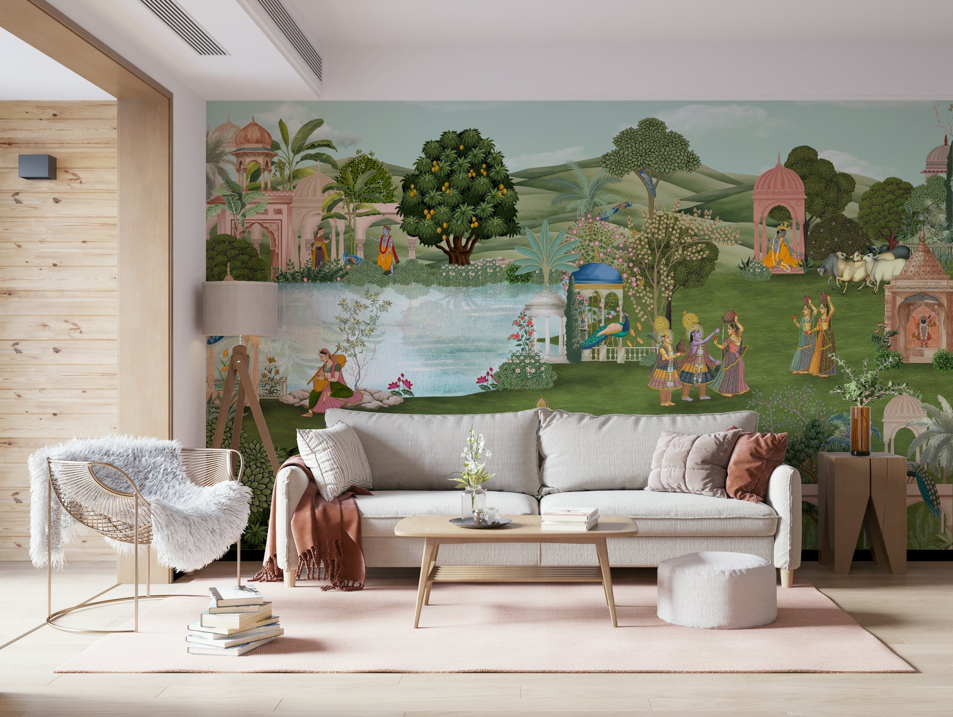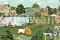 Escape to a tranquil realm with "Pahari Peacocks", where idyllic landscapes meet regal elegance. This captivating design immerses you in a timeless scene inspired by traditional Pahari miniature art. Lush greenery unfolds across rolling hills, dotted with ornate pavilions and serene water features. Majestic peacocks, symbols of beauty and grace, roam freely, adding splashes of vibrant color to the pastel palette. Figures adorned in traditional attire move through the landscape, hinting at stories of devotion and harmony with nature. Rich details abound, from the intricate architecture of the pavilions to the meticulously rendered foliage. "Pahari Peacocks" evokes a sense of calm and wonder, transforming any wall into a window overlooking a peaceful paradise, inviting contemplation and a touch of royal charm into your space.