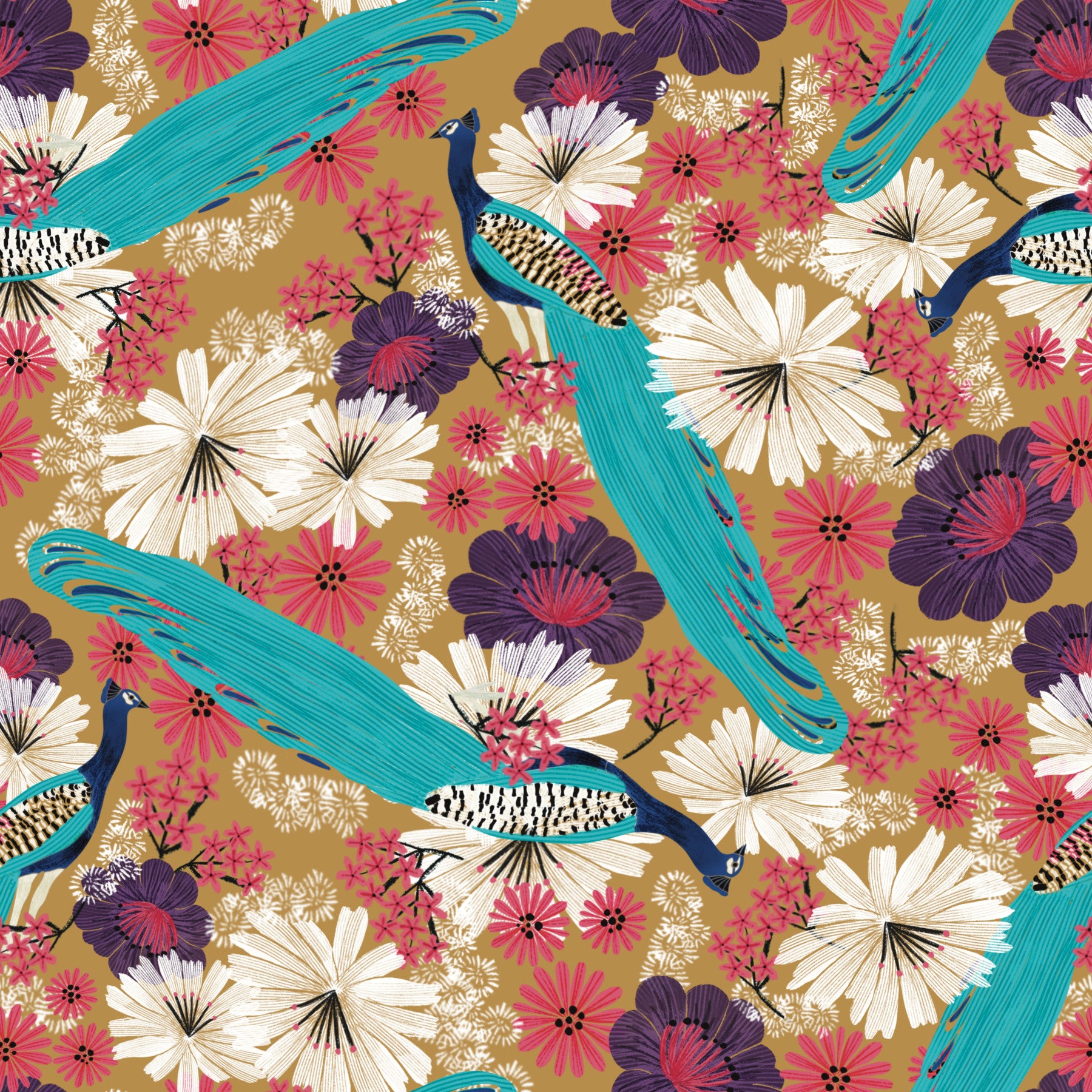 Invite the elegance of nature indoors with this vibrant peacock and floral design. The turquoise plumage paired with rich pink and violet blooms creates a striking visual impact. This wallpaper for walls injects personality into any room. The golden-beige background allows the colors to pop, making it an excellent choice for living rooms, bedrooms, or even a sophisticated dining room. It infuses spaces with an artistic flair, perfect for creating a welcoming and stylish atmosphere.