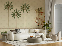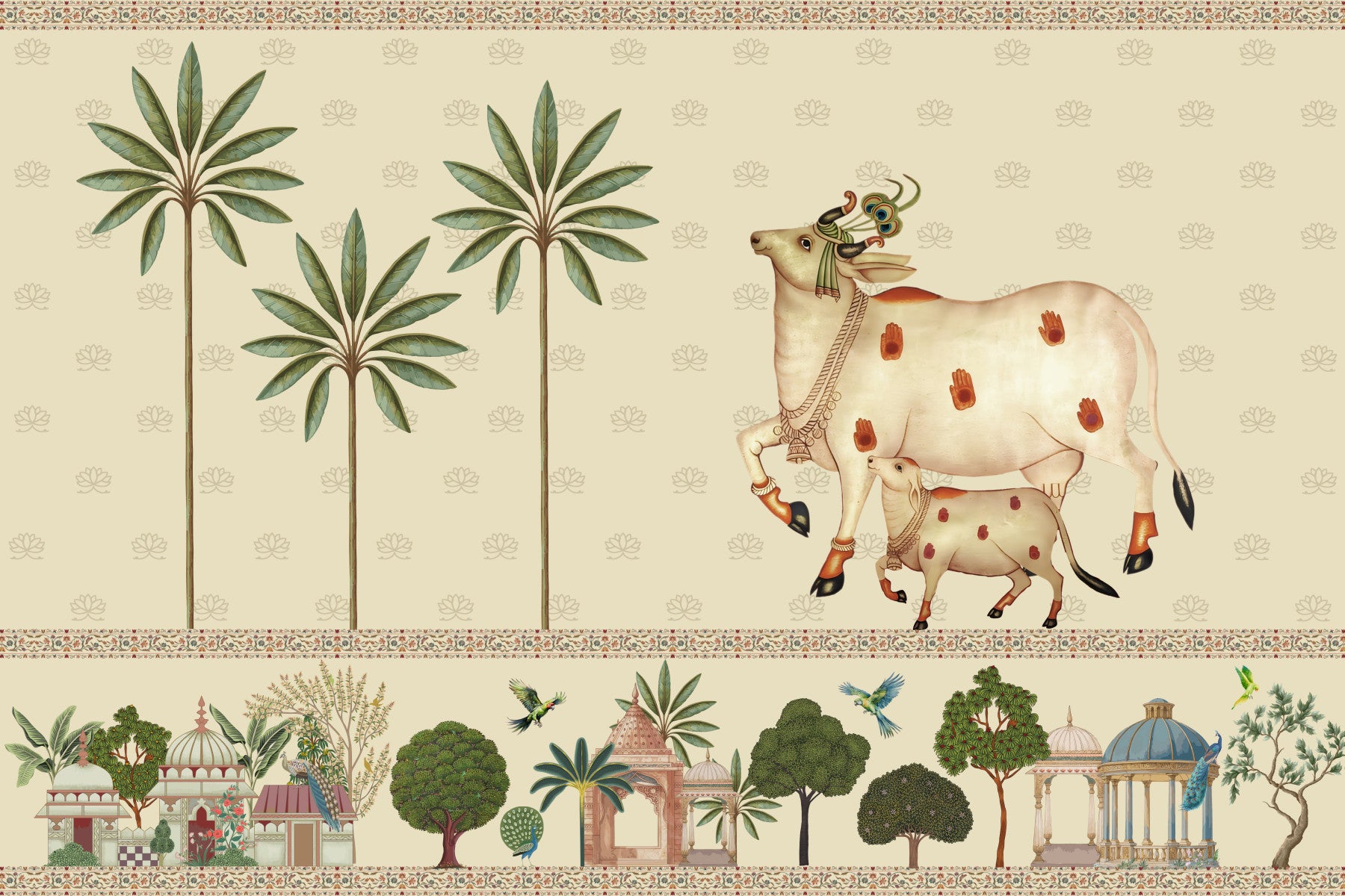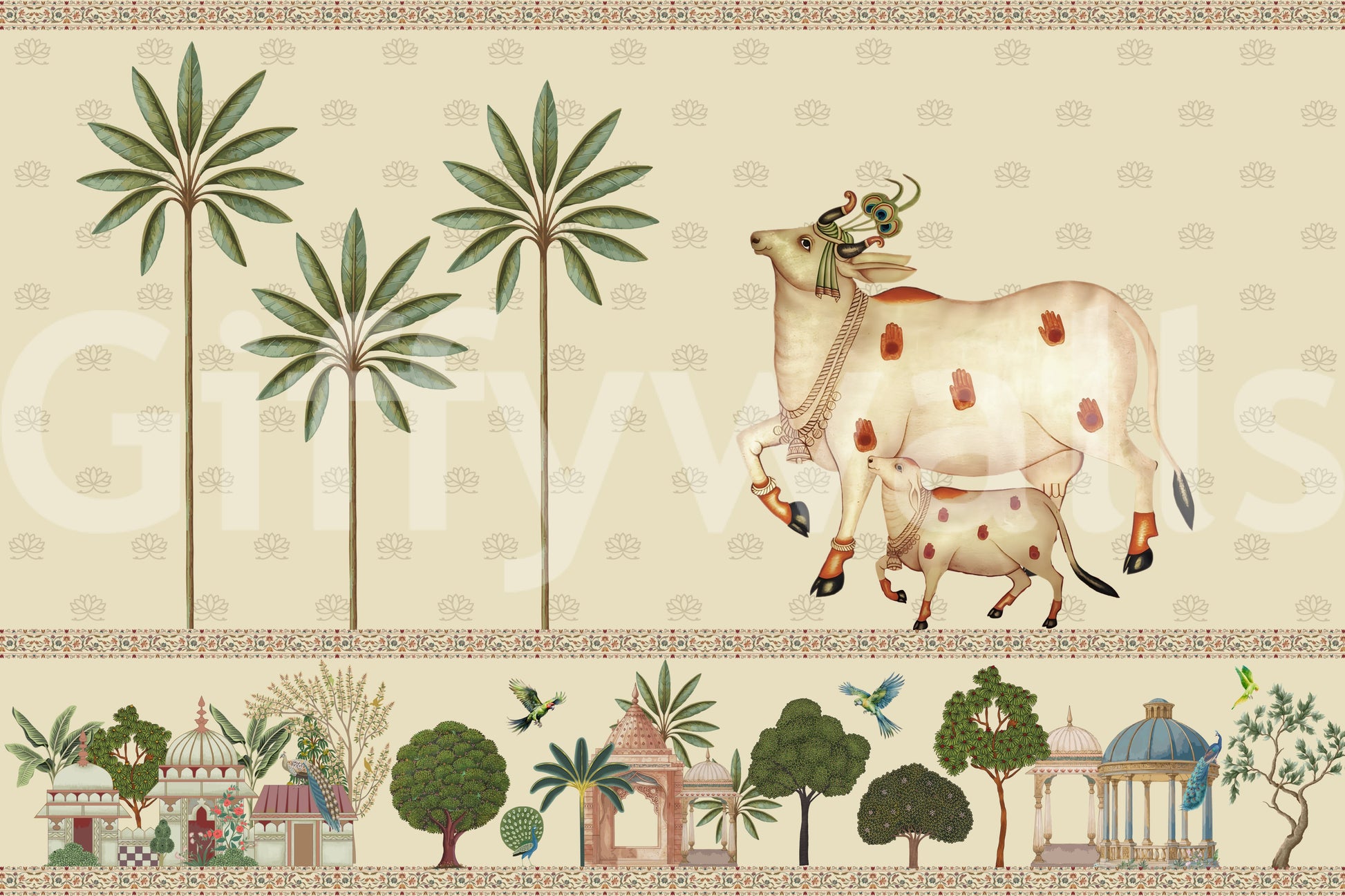 Evoke the spiritual essence of rural India with "Pichwai Parampara," a stunning wallcovering that pays homage to the traditional art form of Pichwai paintings. This design presents a serene landscape featuring sacred cows adorned with auspicious handprints and peacock feathers, symbols of prosperity and devotion. Towering trees and charming architectural structures inspired by classic Indian designs are depicted in exquisite detail, all rendered in a soothing palette of soft greens, browns, and creams. A meticulously detailed border frames the scene, adding an extra layer of cultural richness. Invite a sense of peace, tradition, and artistic elegance into your space with this timeless depiction of Indian heritage. Transform any room into a sanctuary of art and spirituality.