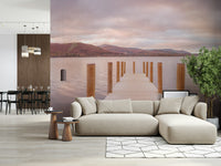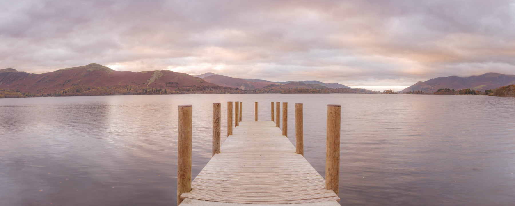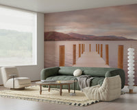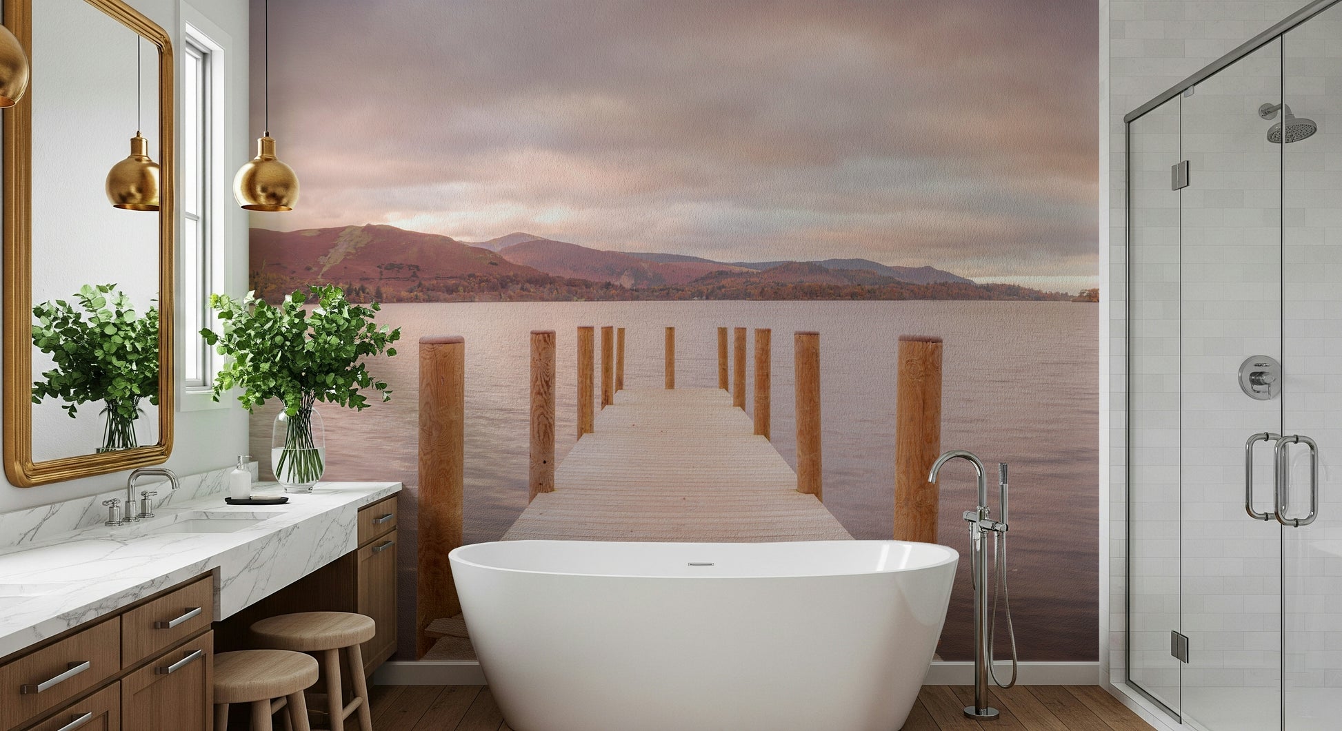 Derwentwater pier, Lake District. Step into a tranquil scene with this calming lake image. It features a wooden pier leading out into calm waters, framed by distant mountains painted with soft, earthy tones. The serene atmosphere creates an instant feeling of peace, perfect for bedrooms, bathrooms, or any space where you want to invite relaxation. Use this wallpaper for walls to bring a touch of nature’s calm to your living space and complement minimalist interiors.