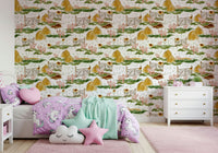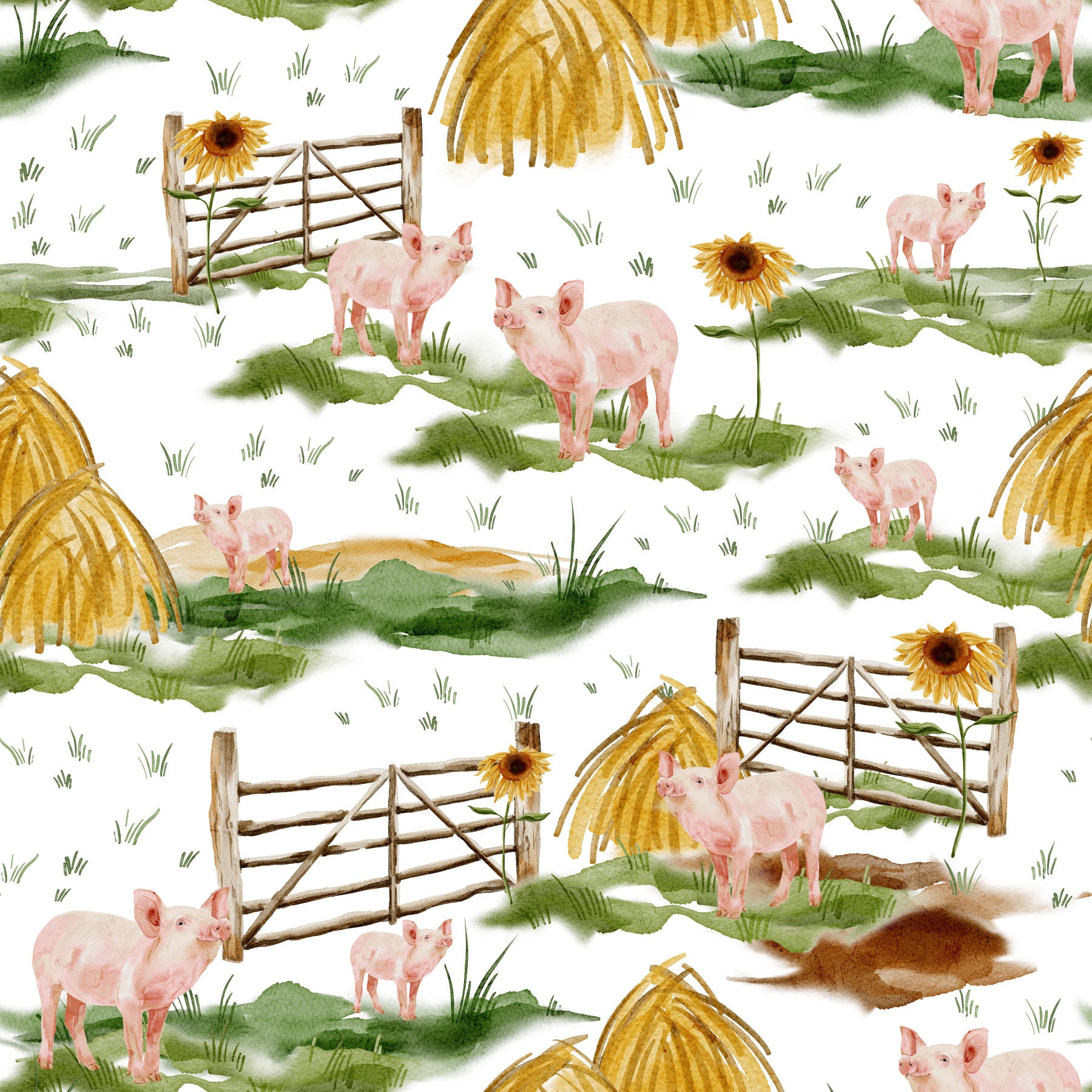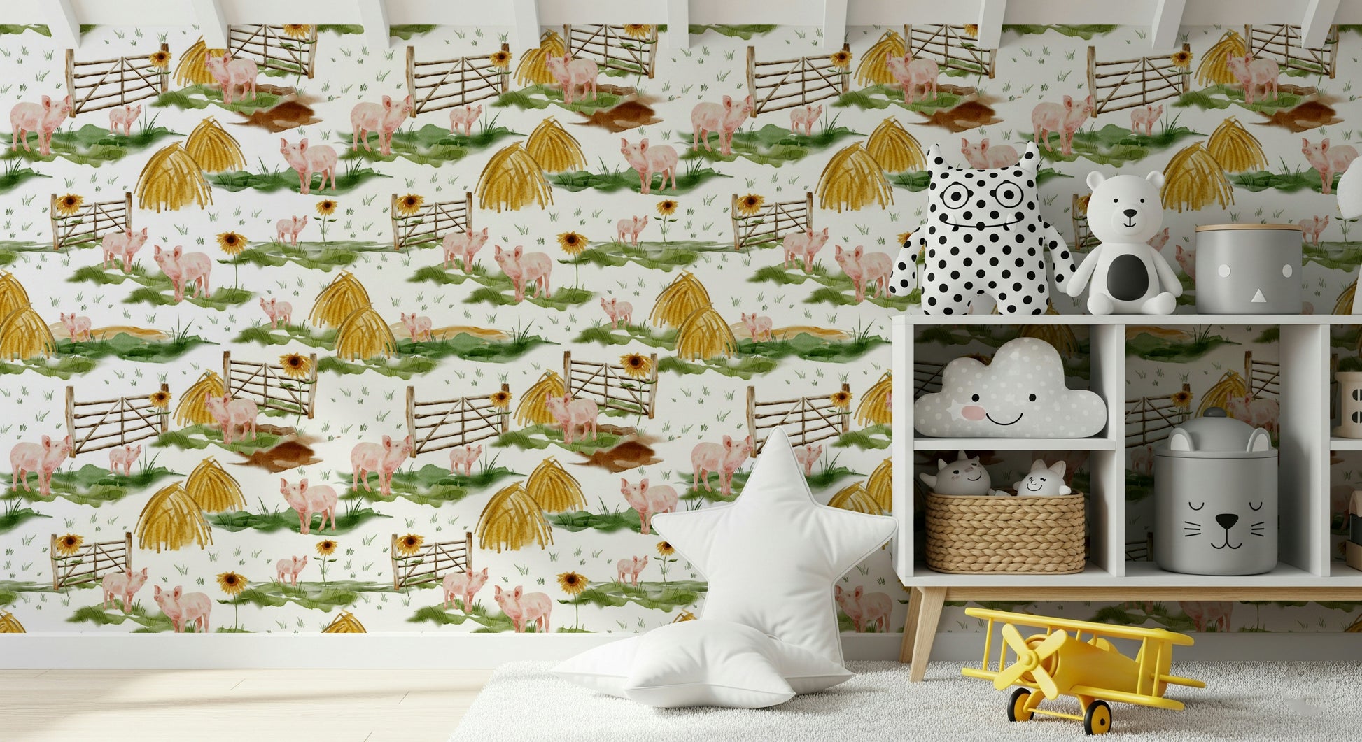 Bring rustic charm to your walls with this delightful watercolor wallpaper by Uta Naumann. This pattern features adorable pink pigs, golden hay bales, and cheerful sunflowers. Soft greens and browns create a tranquil, countryside aesthetic. The playful design works well in a kid's room, nursery, or kitchen. With its hand-painted feel, this wallpaper adds a touch of warmth and whimsy to any space. Use this wallpaper for walls to create a heartwarming feature wall in any room. It pairs perfectly with farmhouse or cottage-style interiors.