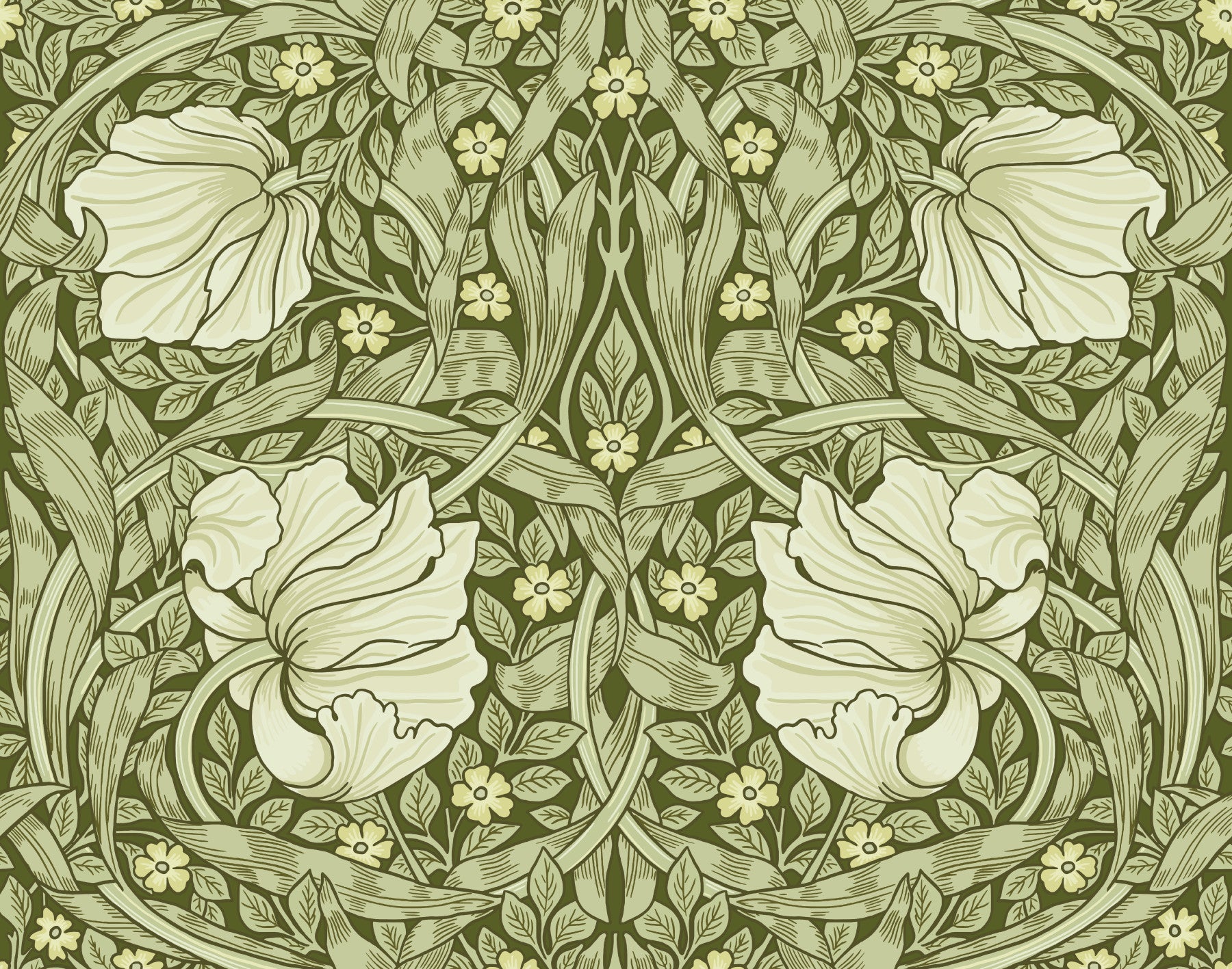 Indulge in the timeless elegance of "Pimpernel by William Morris 14." This wallpaper showcases a captivating tapestry of stylized pimpernel blossoms and lush foliage in a calming palette of olive greens and creamy whites. The intricate Art Nouveau design, featuring gracefully intertwined leaves and delicately rendered flowers, creates a sense of serene sophistication. A perfect blend of classic and modern, this wallpaper adds a touch of Victorian charm and natural beauty to any space, evoking a feeling of quiet contemplation and refined taste. The symmetrical design offers a balanced aesthetic perfect for accent walls or complete room coverage.