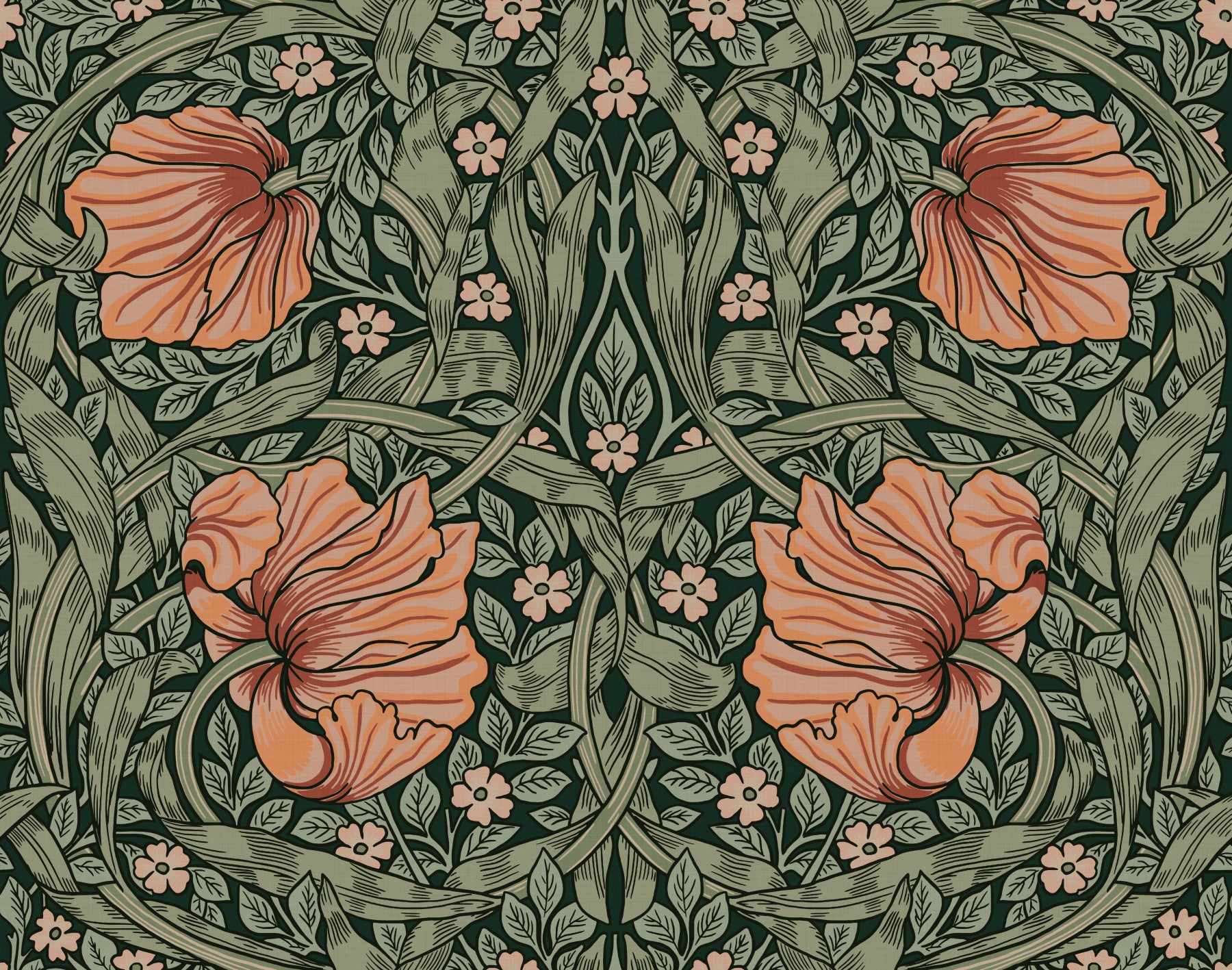 Indulge in the timeless elegance of "Pimpernel by William Morris 24." This wallpaper design showcases a captivating interplay of stylized pimpernel flowers in soft coral hues, delicately nestled amongst lush, intricately detailed foliage rendered in muted greens. The pattern's symmetrical arrangement creates a sense of harmonious balance, evoking a serene and sophisticated mood. The rich, dark background enhances the vibrancy of the blossoms and the crisp lines of the leaves. A perfect blend of Art Nouveau inspiration and classic botanical artistry, this wallpaper transforms any space into a haven of refined beauty and tranquility. Experience the enduring charm of William Morris’s iconic style with this updated interpretation.