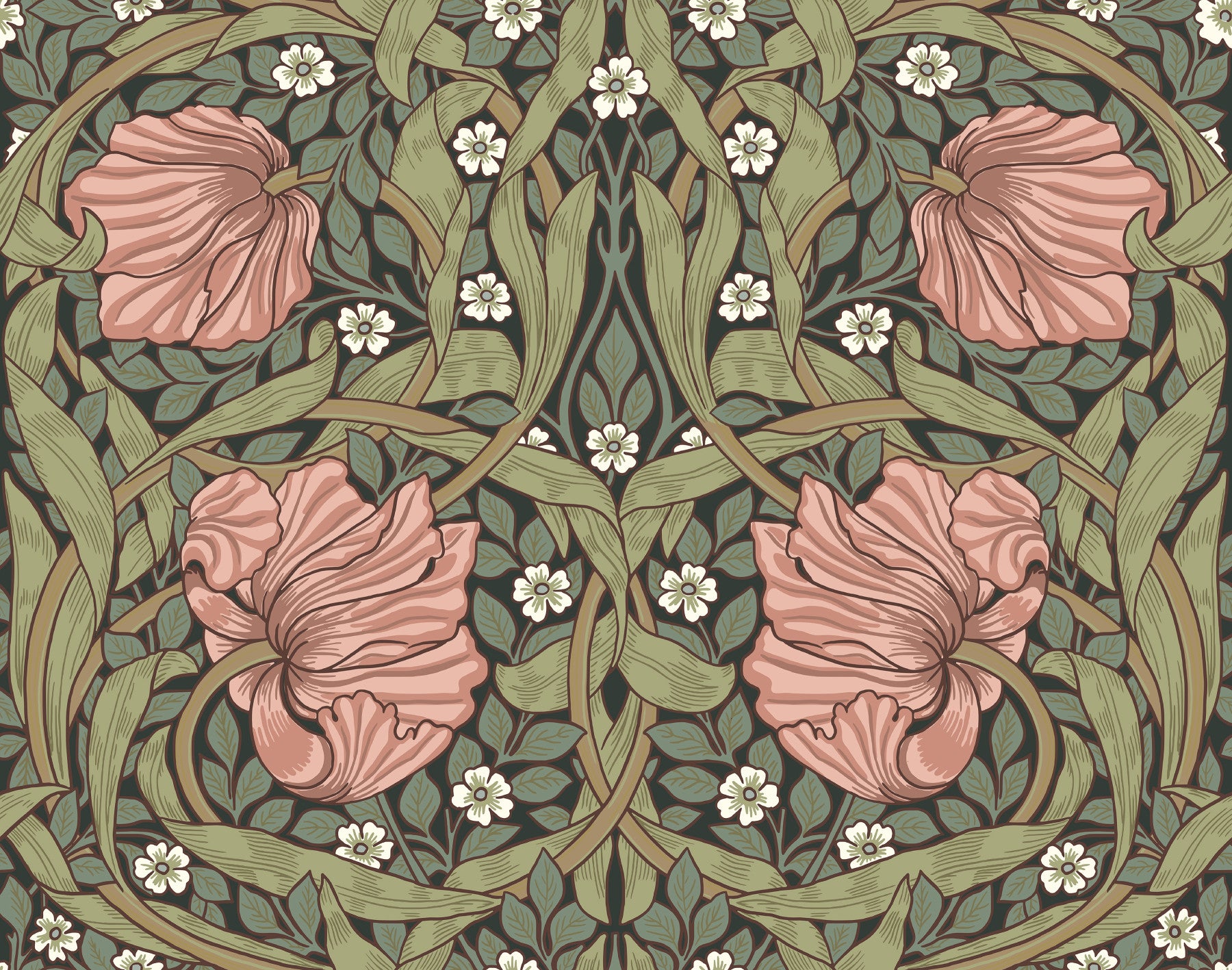 Indulge in the timeless elegance of "Pimpernel by William Morris 7." This wallpaper design showcases a captivating interplay of blush pink pimpernel blossoms and intricate, flowing foliage rendered in muted greens and deep teal. The meticulously detailed Art Nouveau style evokes a sense of serene sophistication. Symmetrical patterns create a sense of balance and harmony, making it perfect for adding a touch of classic beauty to any room. The rich color palette and detailed botanical illustrations create a luxurious and calming atmosphere, transporting you to a world of refined artistry and natural charm.