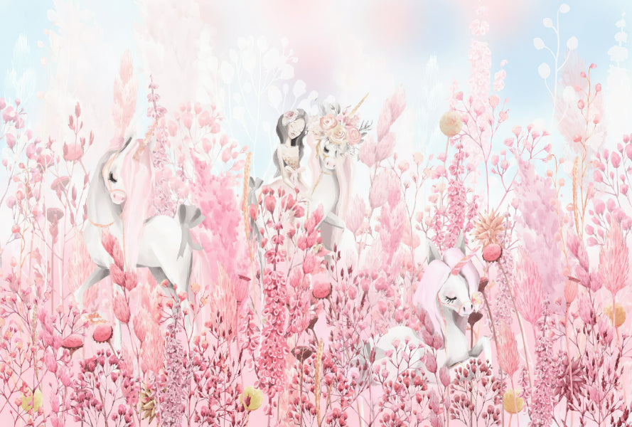 Get into a world of dreams and whispers of fantasy with the pink unicorn forest wall mural, an artistic creation that transforms any girl's room into a realm of daydreams and play. Here, mythical unicorns roam with elegance among an expanse of pink-toned flora, offering a glimpse into a world where magic is as real as the smile on your child’s face. Each aspect of the mural has been crafted to foster a sense of magic and adventure elements that are essential to the playful spirit of childhood. This girls room wallpaper is an invitation to a place where unicorns are friends and protectors, where the walls echo with the laughter of imaginative play and the quiet hush of dream-filled slumber.
