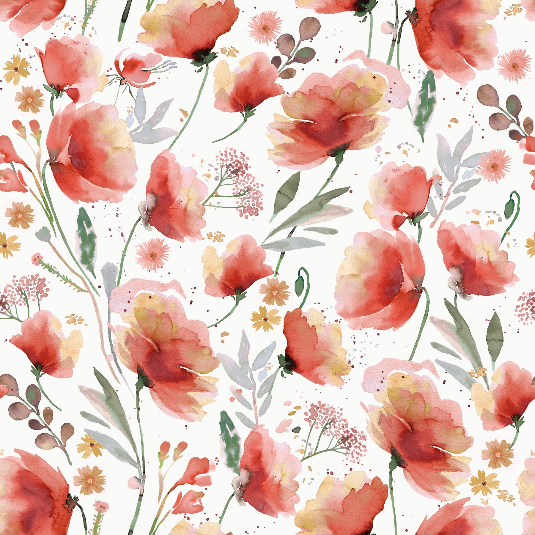 Embrace the serene beauty of a sun-drenched meadow with this captivating wallpaper. Loose watercolor strokes depict a profusion of poppies in varying shades of orange and red, creating a dreamy, almost impressionistic effect. Delicate accompanying wildflowers and wispy foliage add depth and texture to the scene, while subtle splashes of color enhance the overall feeling of warmth and vibrancy. Perfect for adding a touch of romantic, nature-inspired elegance to any digital device.
