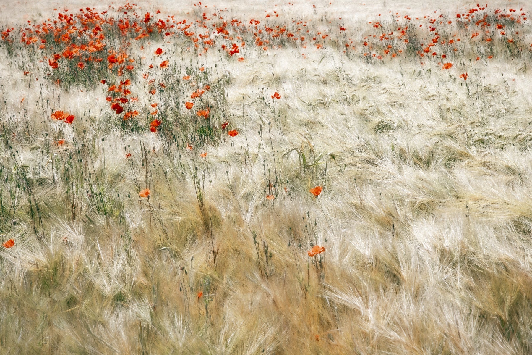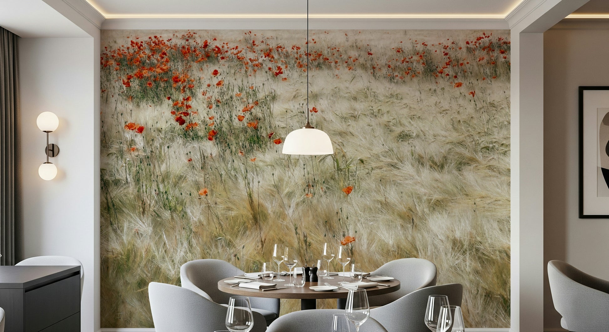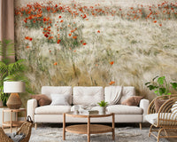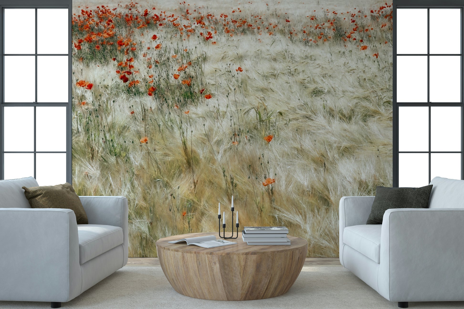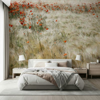Transform your space with this serene field of poppies. Golden wheat sways gently, dotted with bursts of red poppies. This wallpaper for walls brings the calmness of the countryside to any room. It particularly suits a living room or bedroom, where its soft tones and floral design will add a touch of nature and peace. The design complements interiors, creating a tranquil and inviting space.