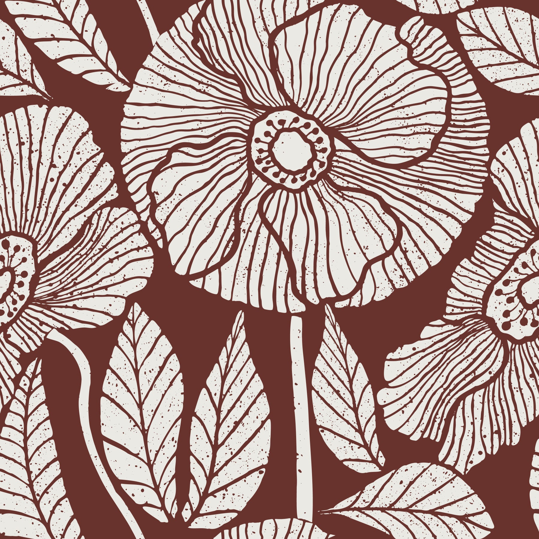 Poppy Floral Modern design, rustic cream bloom on deep burgundy surface.