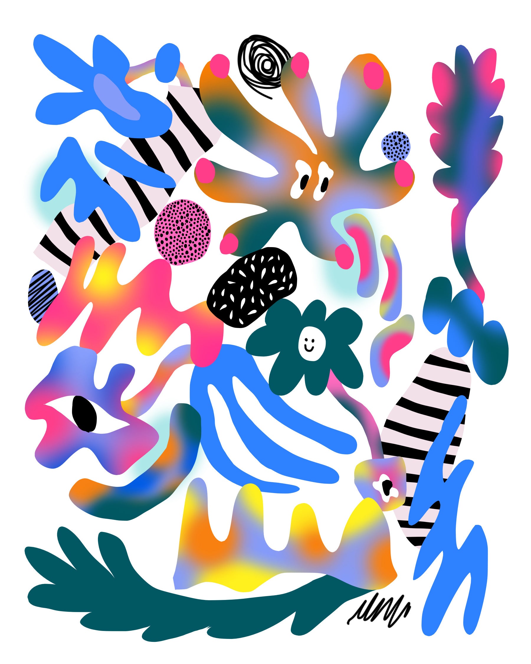 Dive into the bizarre beauty of Radioactive Spring a wallpaper that bursts with otherworldly flora and fauna. This captivating abstract design presents a landscape where nature has evolved in unexpected, vibrant ways. Imagine a world where flowers smile back at you and leaves shimmer with electric blues and pinks, where every shape pulsates with an inner light. Bold colors and playful shapes collide in a chaotic yet harmonious composition, creating a visual feast for the eyes. The design features mutated leaves, oddly shaped flowers, and other unusual elements, arranged to suggest growth and vibrancy in an environment altered by mysterious forces. It's a visual representation of a vibrant ecosystem that's somehow gone gloriously wrong, resulting in a refreshingly unique piece of abstract art perfect for any screen seeking a touch of eccentric charm.