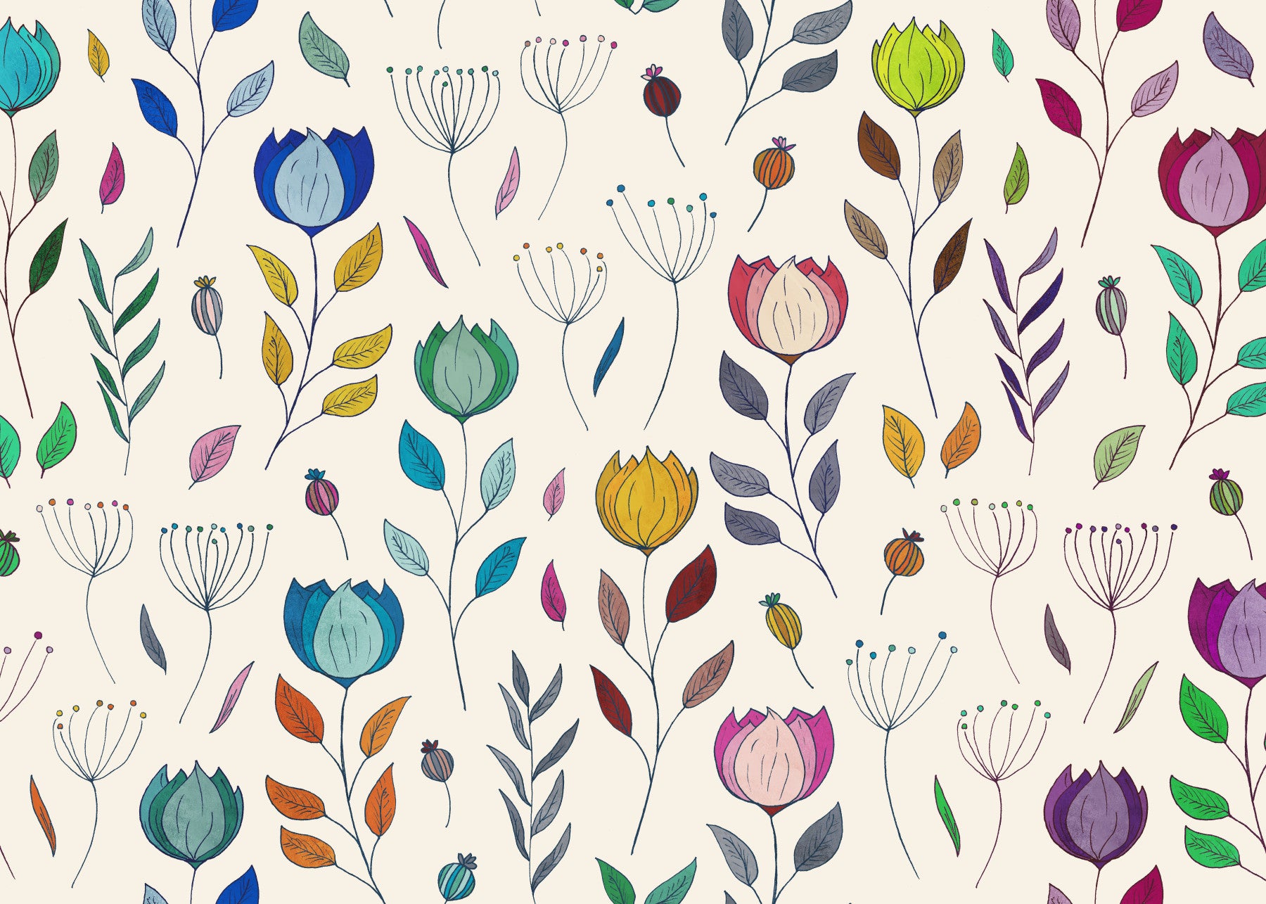 Adorn your space with this cheerful floral wallpaper for walls. It showcases colorful, hand-drawn flowers and leaves on a light backdrop. This playful pattern will bring a fresh and vibrant feel to any room. The range of colors, including blues, greens, yellows, and pinks, ensures that it complements a variety of interior styles, from modern to boho. Consider this design for a kid's room, bedroom, or living area to create an inviting and joyful atmosphere. The intricate details and lively color palette will surely elevate your decor.