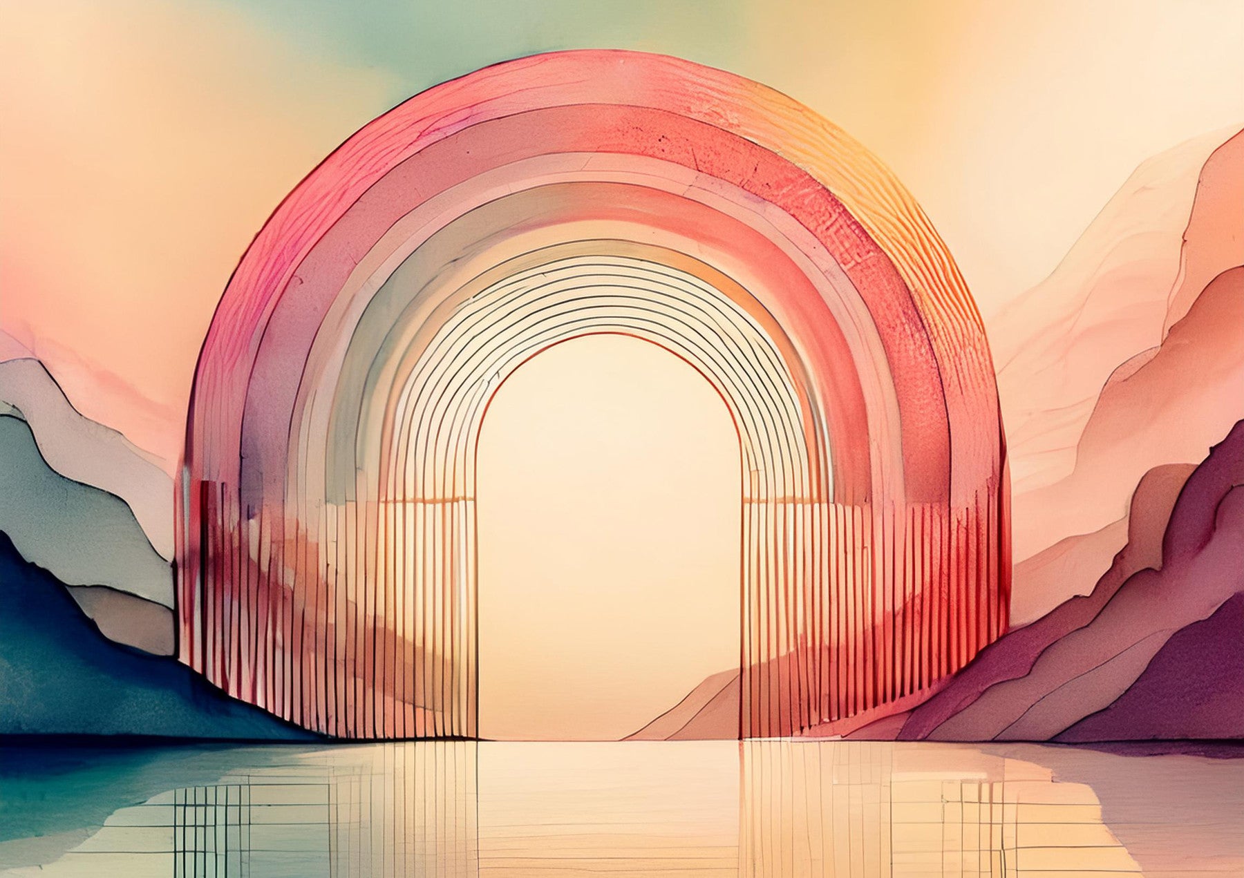 This wallpaper features a captivating abstract landscape dominated by a large, arched structure reminiscent of a rainbow. The arch is composed of layered, translucent bands of warm, earthy tones, ranging from soft pinks and peaches to deeper reds and oranges. The background showcases a serene watercolor-style depiction of mountains reflected in a calm body of water. The overall mood is peaceful and tranquil, evoking a sense of serenity and wonder. The interplay of color and form creates a visually stunning and dreamlike effect, perfect for adding a touch of artistic sophistication to any room.