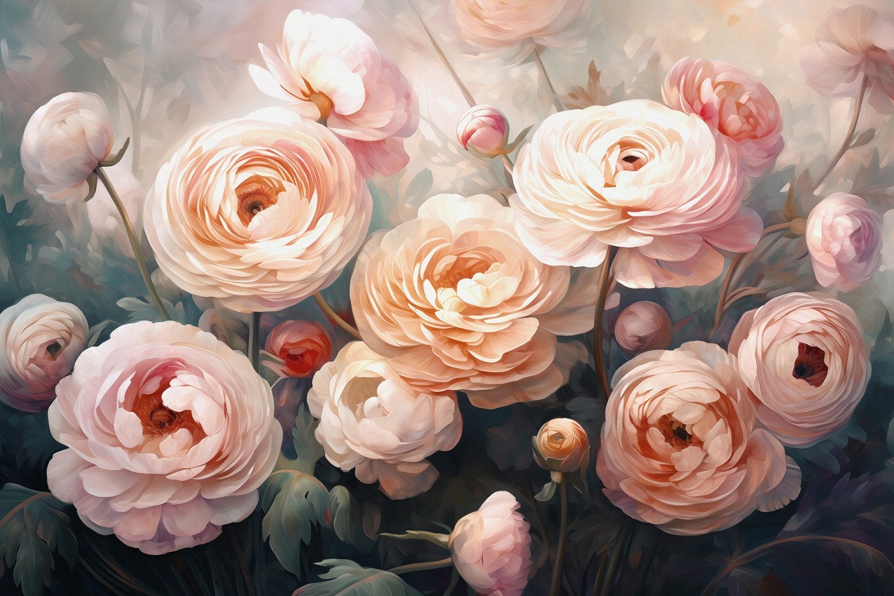 Create a tranquil space with ranunculus pink flower mural wallpaper.