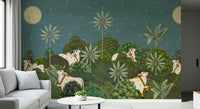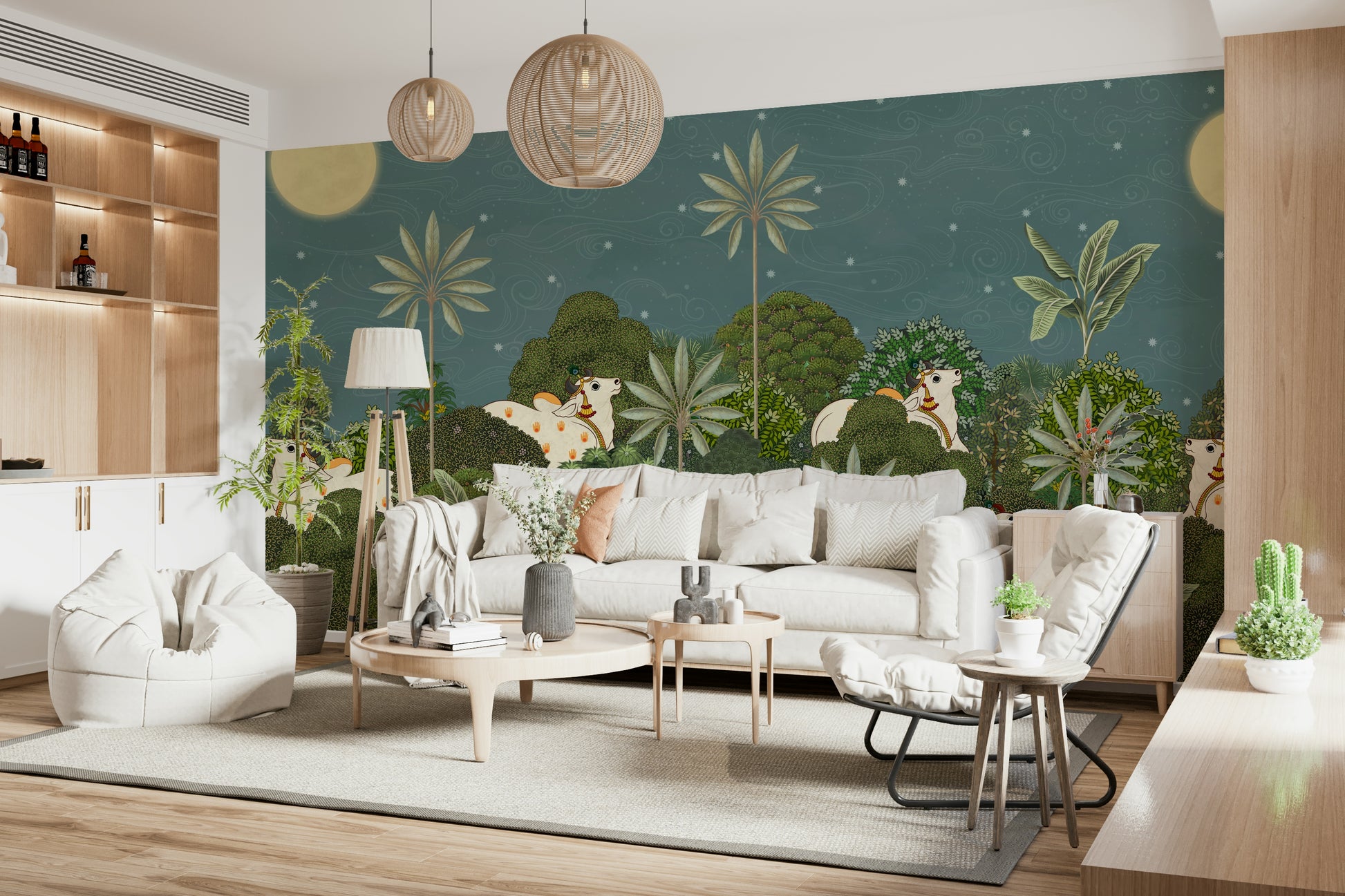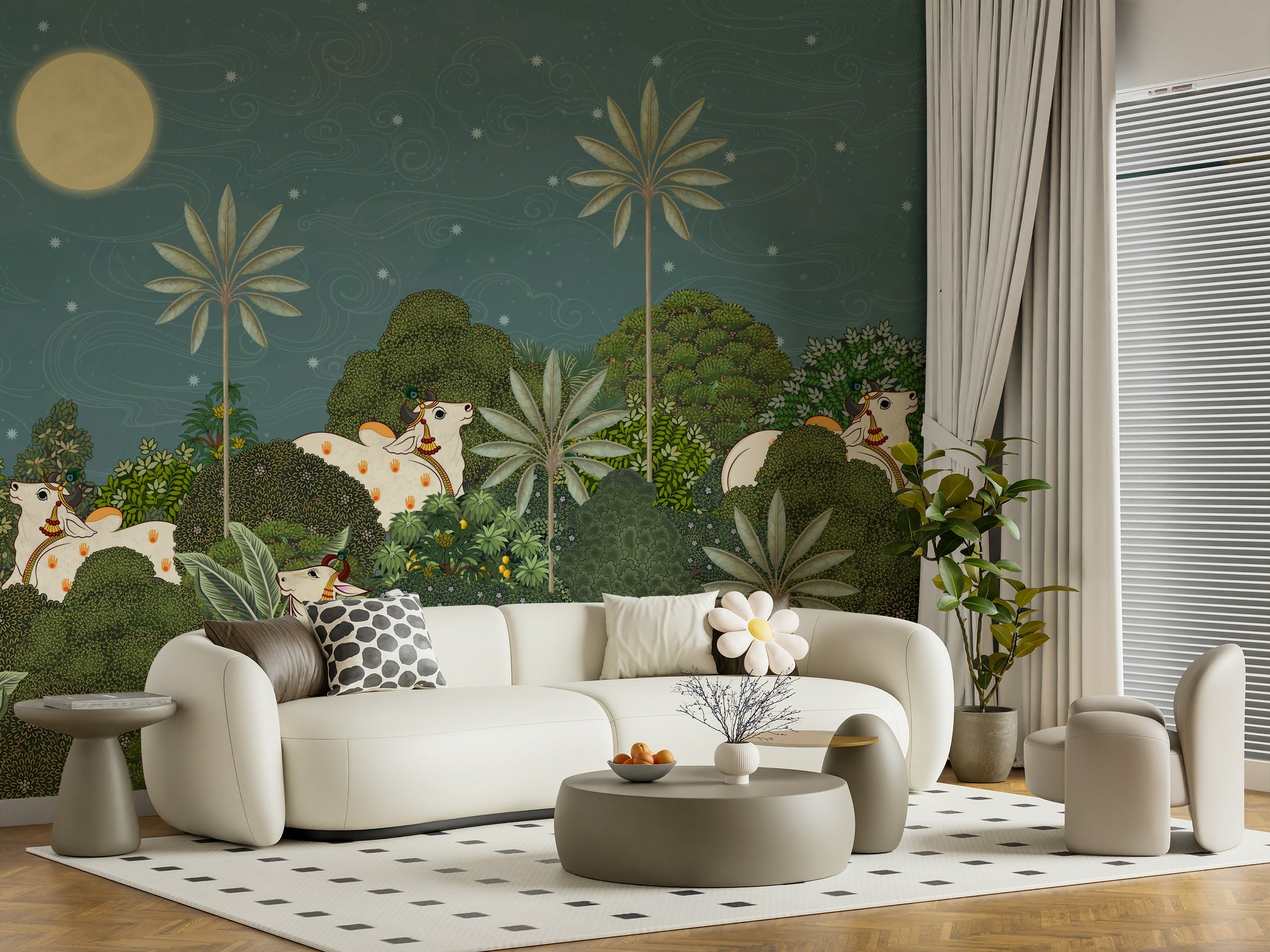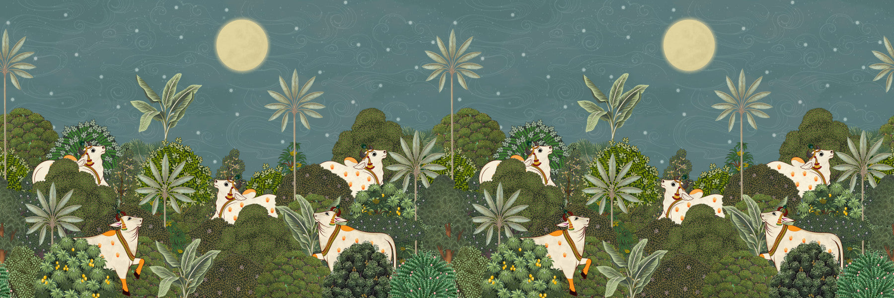 Embrace the mystique of the night with Ratri Pichwai, a captivating wall décor that evokes the serene beauty of a moonlit Indian landscape. Inspired by the traditional Pichwai art form, this enchanting piece showcases a lush, verdant forest bathed in the soft glow of a full moon. Gentle, stylized cows, adorned with traditional markings and embellishments, graze peacefully amidst the dense foliage. Tall, elegant palm trees reach towards a deep teal sky speckled with twinkling stars and ethereal clouds, creating a sense of tranquility and wonder. This wall adornment captures the essence of a nocturnal pastoral scene, blending rich cultural heritage with a calming, dreamlike atmosphere. Invite the magic of Ratri Pichwai into your home and transform any room into a sanctuary of peace and artistic expression.