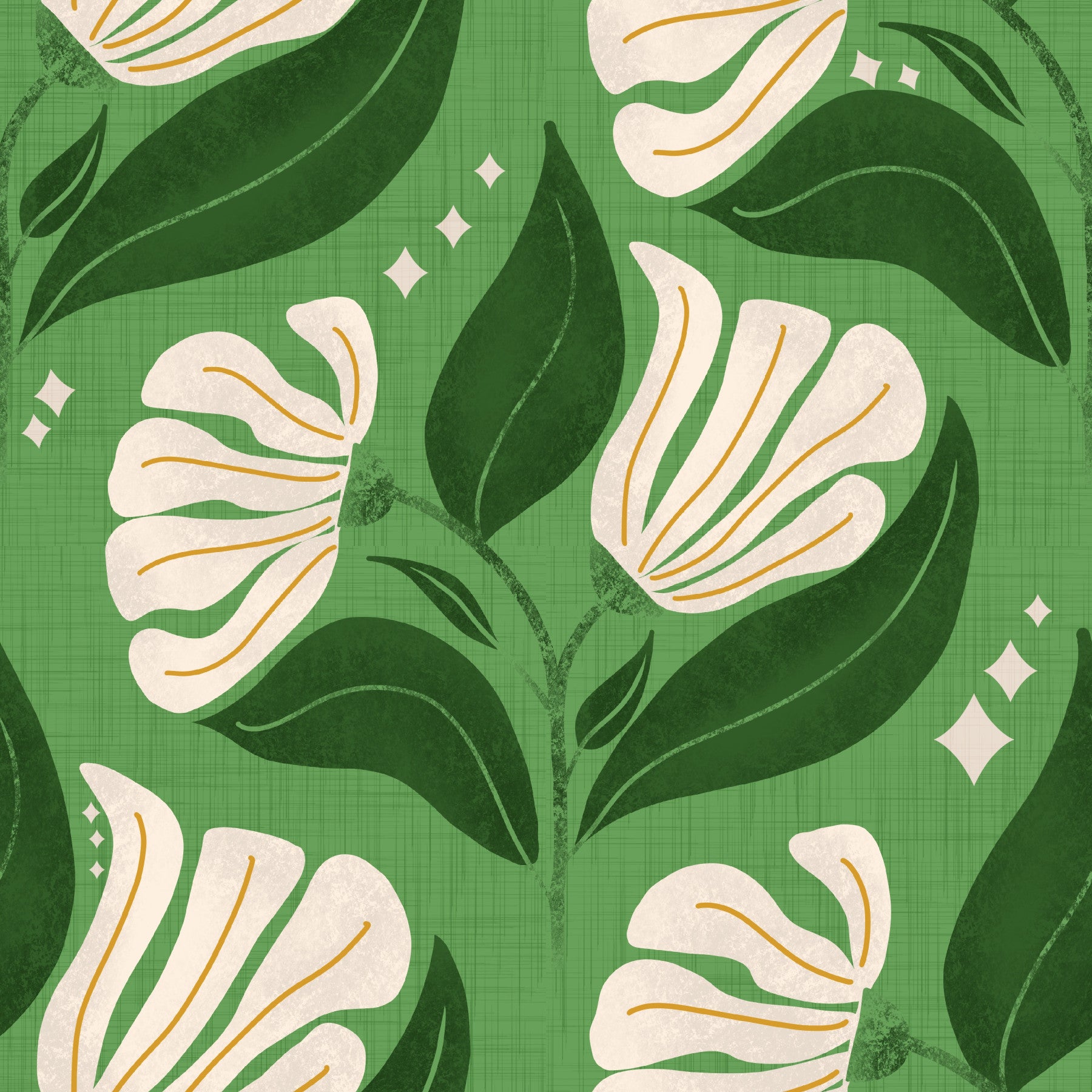 Step back in time with this groovy "Retro 70s Cream Florals on Avocado Olive Green" wallpaper! This design channels the free-spirited energy of the 1970s, showcasing bold, vintage-inspired floral motifs. Creamy, textured flowers bloom against a backdrop of lush avocado olive green, creating a warm and inviting atmosphere. The oversized petals are adorned with delicate golden accents, adding a touch of retro glamour.