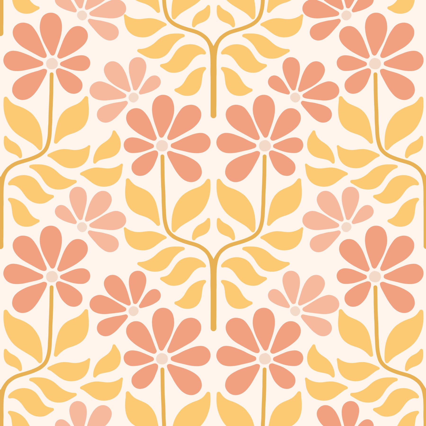 Step back in time with this retro-inspired floral wallpaper. The design features a captivating arrangement of stylized flowers and leaves in soft peach, blush pink, and golden yellow hues. The repeating pattern evokes a sense of nostalgia and timeless charm, adding a touch of vintage sophistication to any space. Its simple yet elegant aesthetic creates a peaceful ambiance, making it a beautiful addition to bedrooms, living rooms, or hallways. The harmonious color palette is easy on the eyes and effortlessly complements various interior styles.