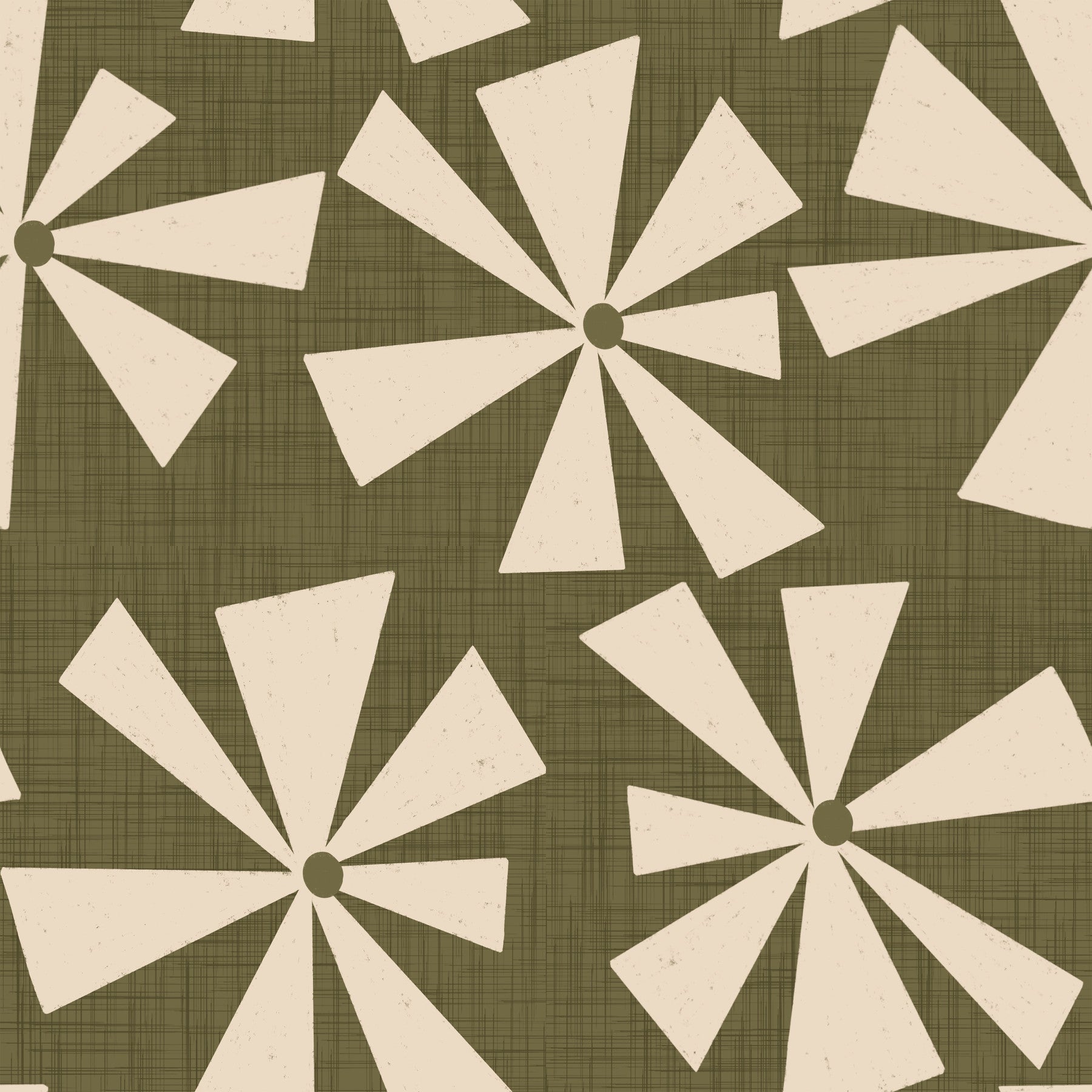 Chic retro wallpaper with textured olive tone and cream geometric burst elements.