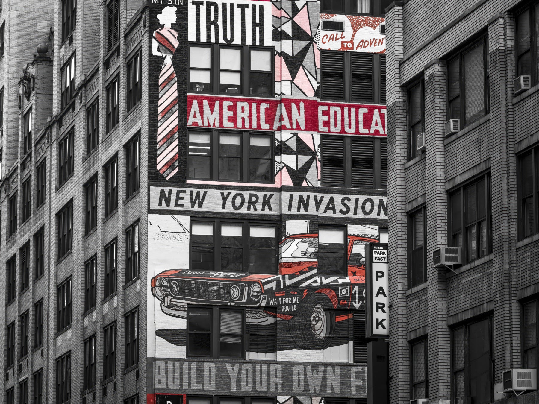 Street style building façade, red car painting, dramatic NYC wall mural.