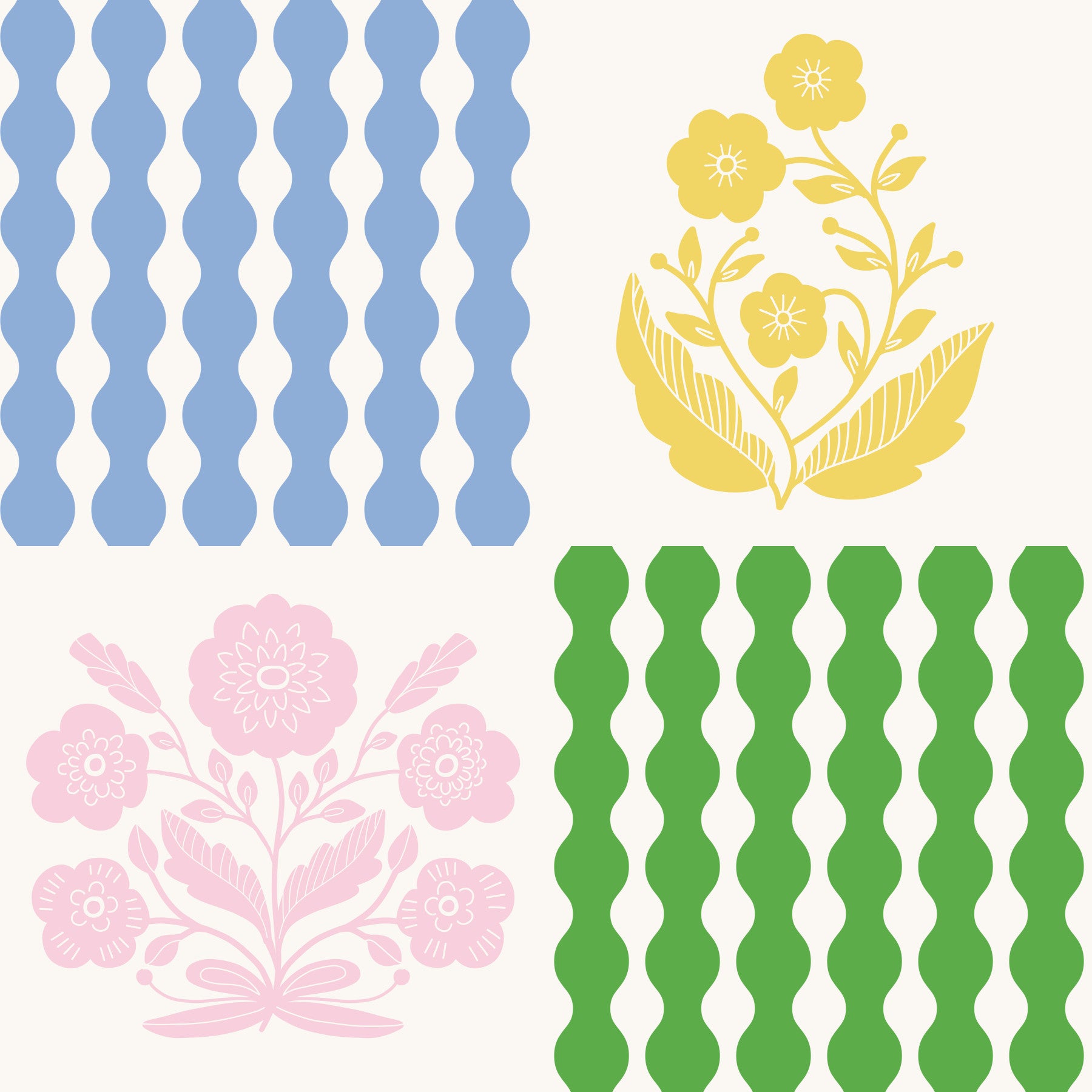 Bring a playful, vintage touch to your rooms with this vibrant wallpaper for walls. The design features bold floral motifs and retro-inspired wave patterns in a delightful mix of pink, yellow, blue, and green. This design adds personality and joy to any space. It works wonderfully in living rooms, bedrooms, or hallways, creating a cheerful and inviting atmosphere. The contrasting colors and retro style complement both modern and classic interiors.