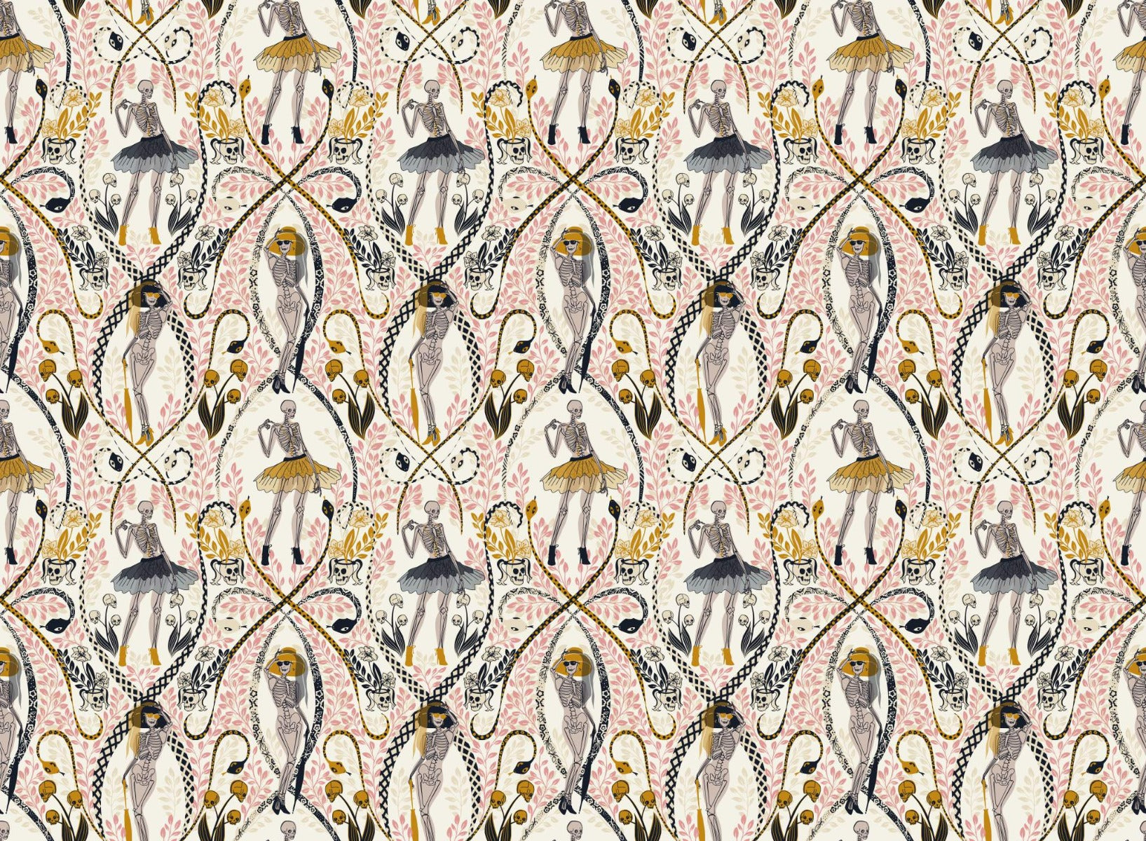 Halloween Themed Wallpaper: Embrace the charm of days gone by with Retro Rendezvous. This design reflects the classic charm of Art Deco wallpaper, combining the sophistication of vintage Halloween decor with dark fantasy wallpaper elements. Each panel features gothic bird wallpaper motifs and spooky ballet wallpaper shapes, set against a backdrop of eerie floral designs that echo the geometric flair characteristic of the roaring '20s. The creepy bird pattern and Halloween ballerina art bring a sense of dark whimsy, making this wallpaper a perfect Halloween accent wall for any room. Whether you want to fill your space with gothic art wallpaper or create a spooky home decor setting, this Halloween illustration graffiti will be perfect for you.